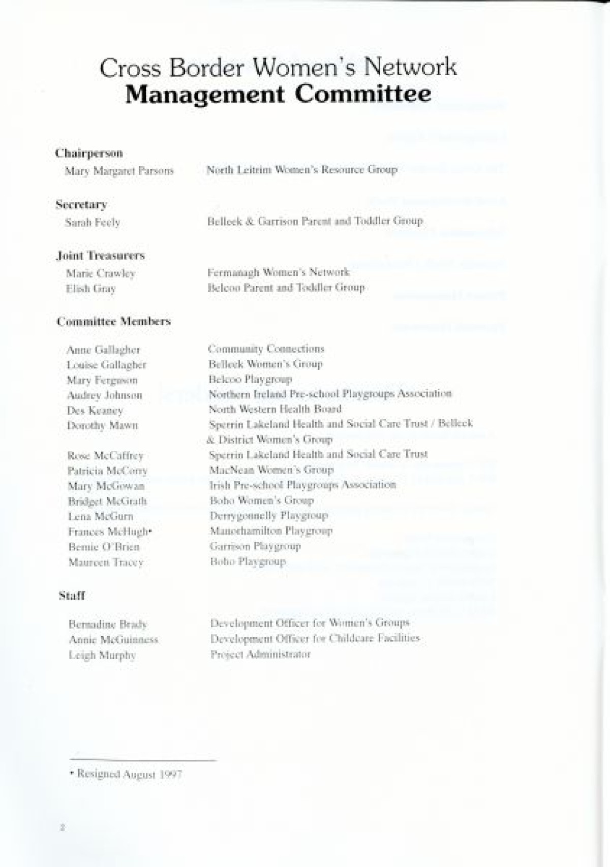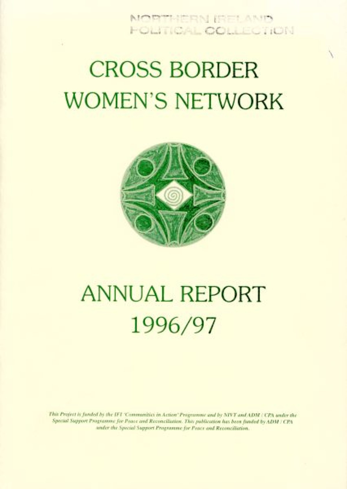 Cross Border Women's Network, 1996/7. Contents include: list of Management Committee members; Chairperson’s Report by Mary Margaret Parsons; Background information about the