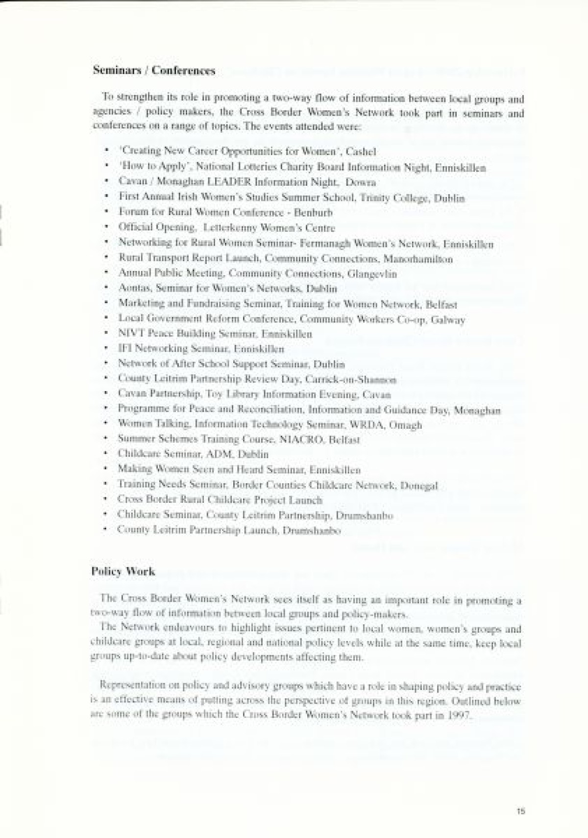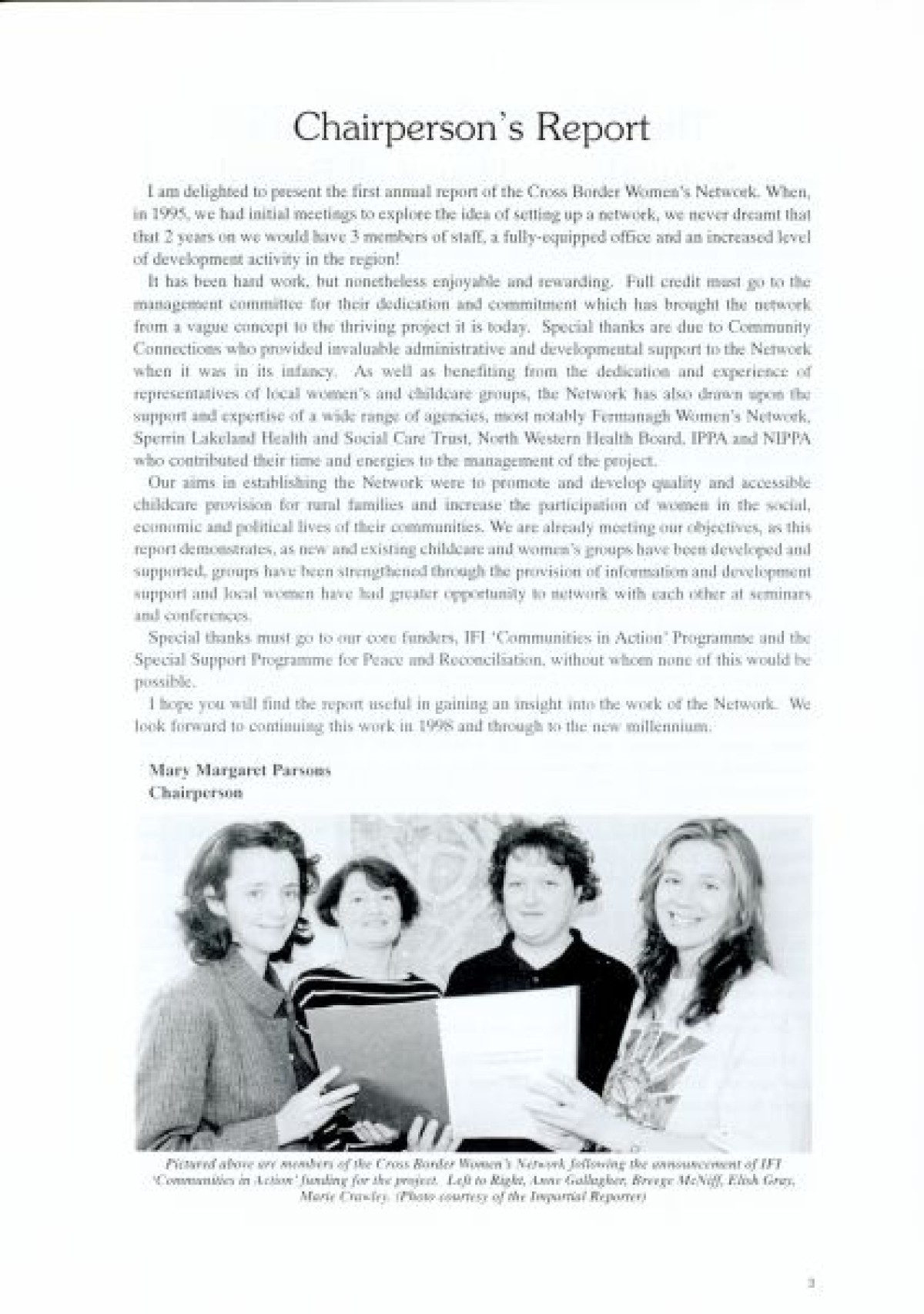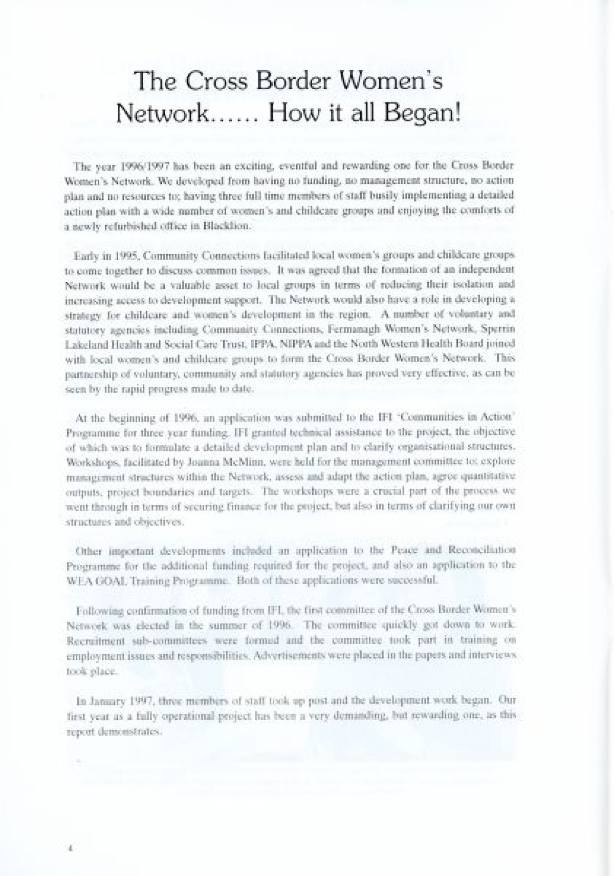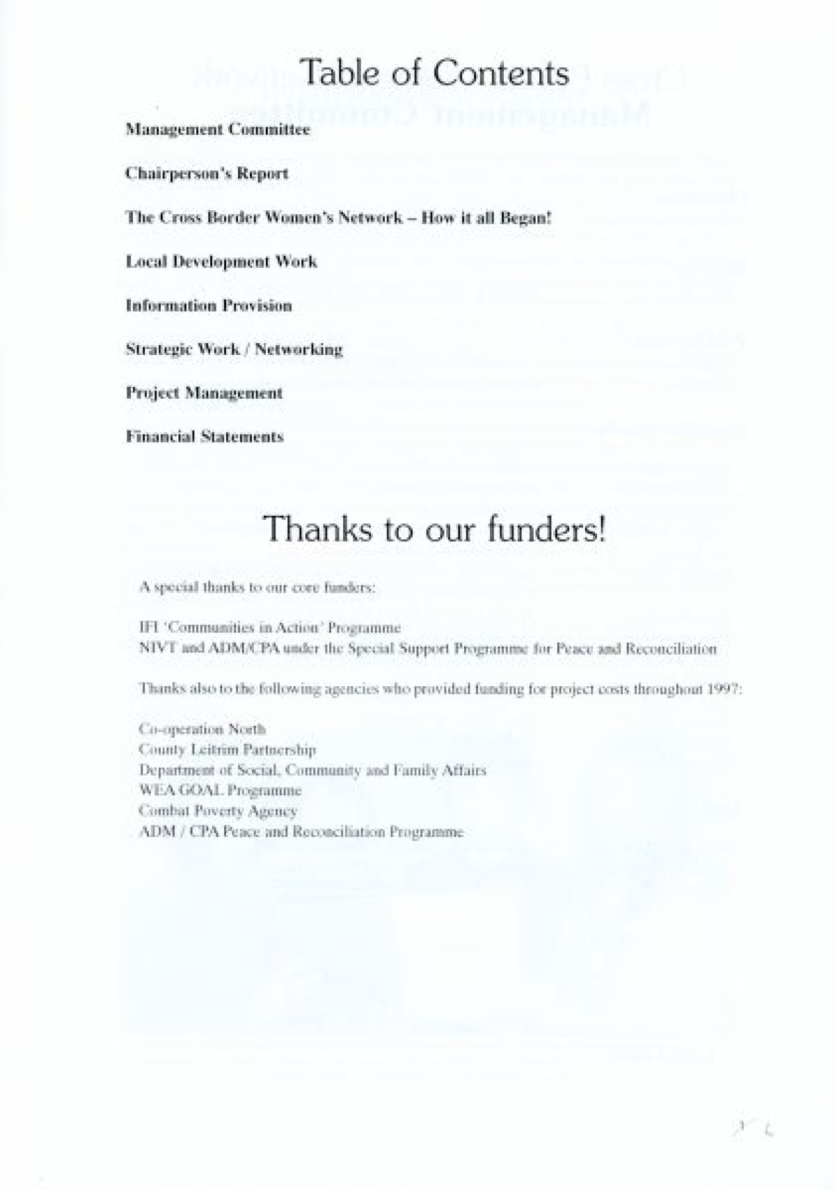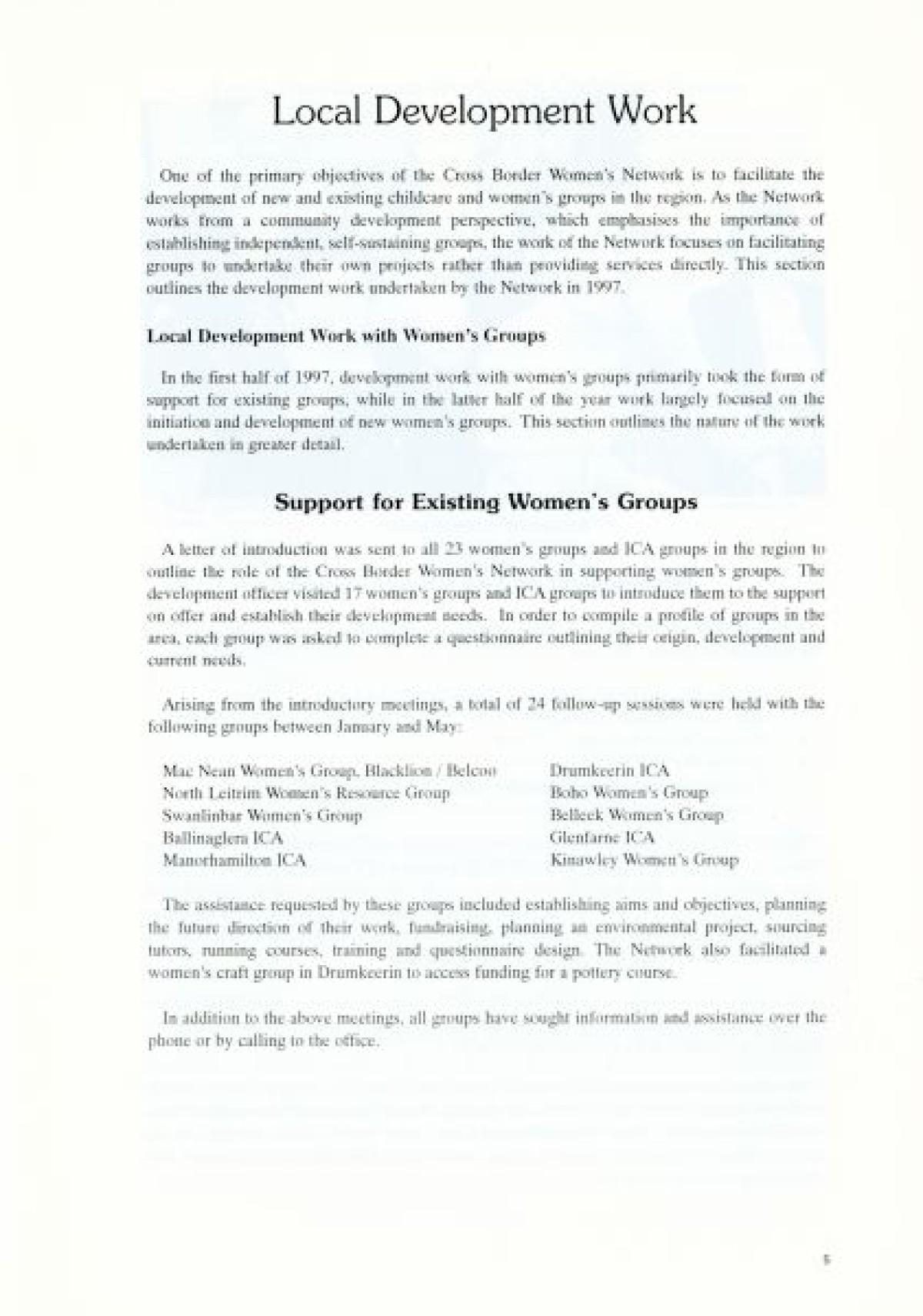 Cross Border Women’s Network; Report on local development work, including development of new women's groups and childcare initiatives; Information Provision via resources and seminars; Project Management, including structure, staff development, planning, evaluation, and public relations; details regarding networks and project collaboration; and Financial Statements.