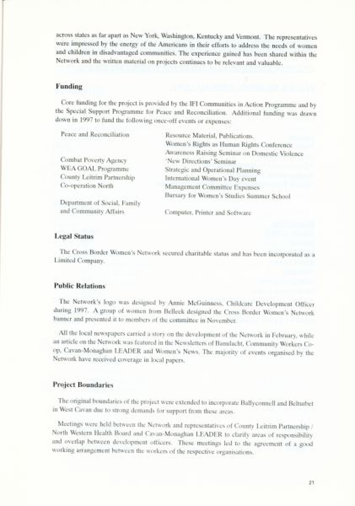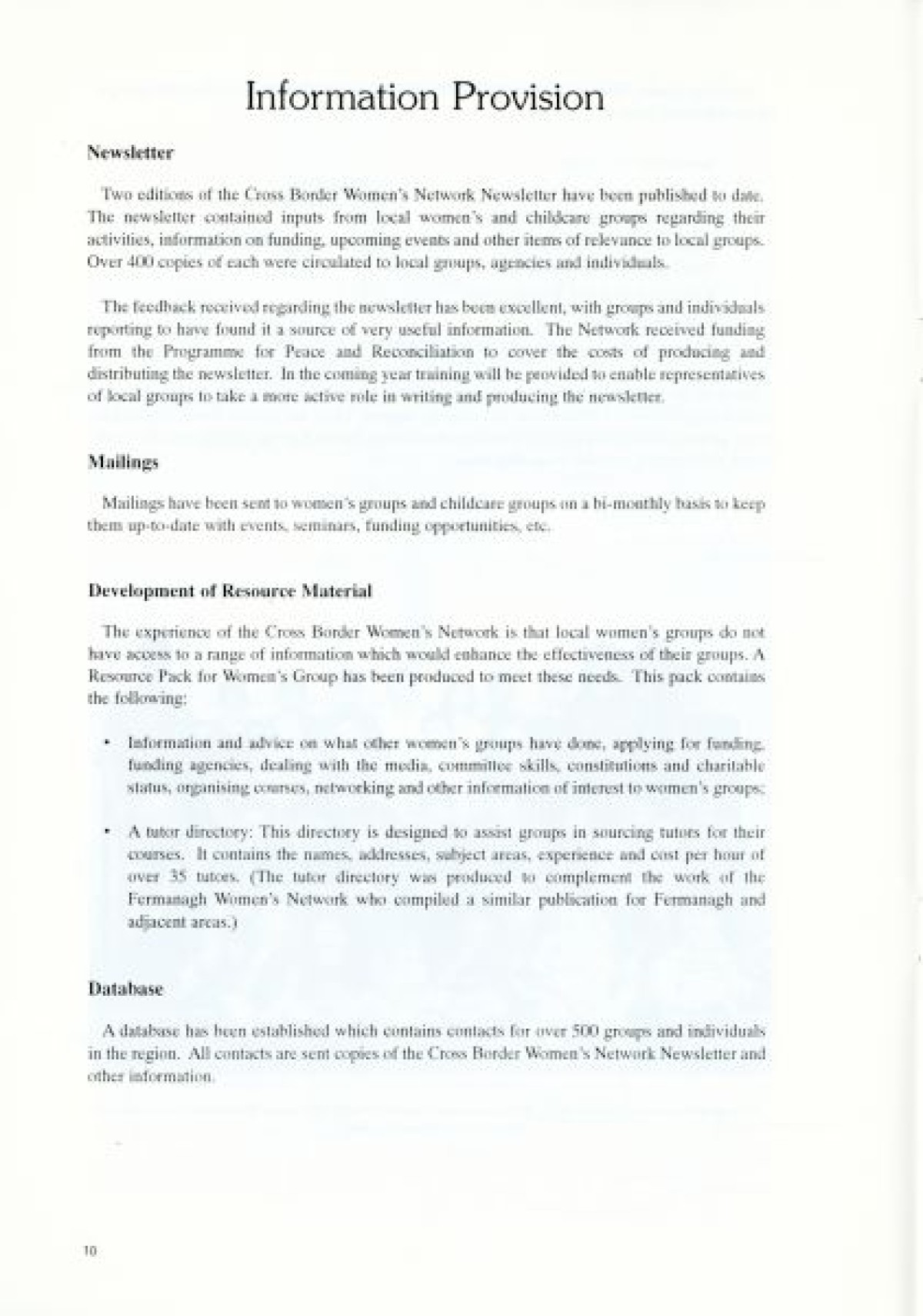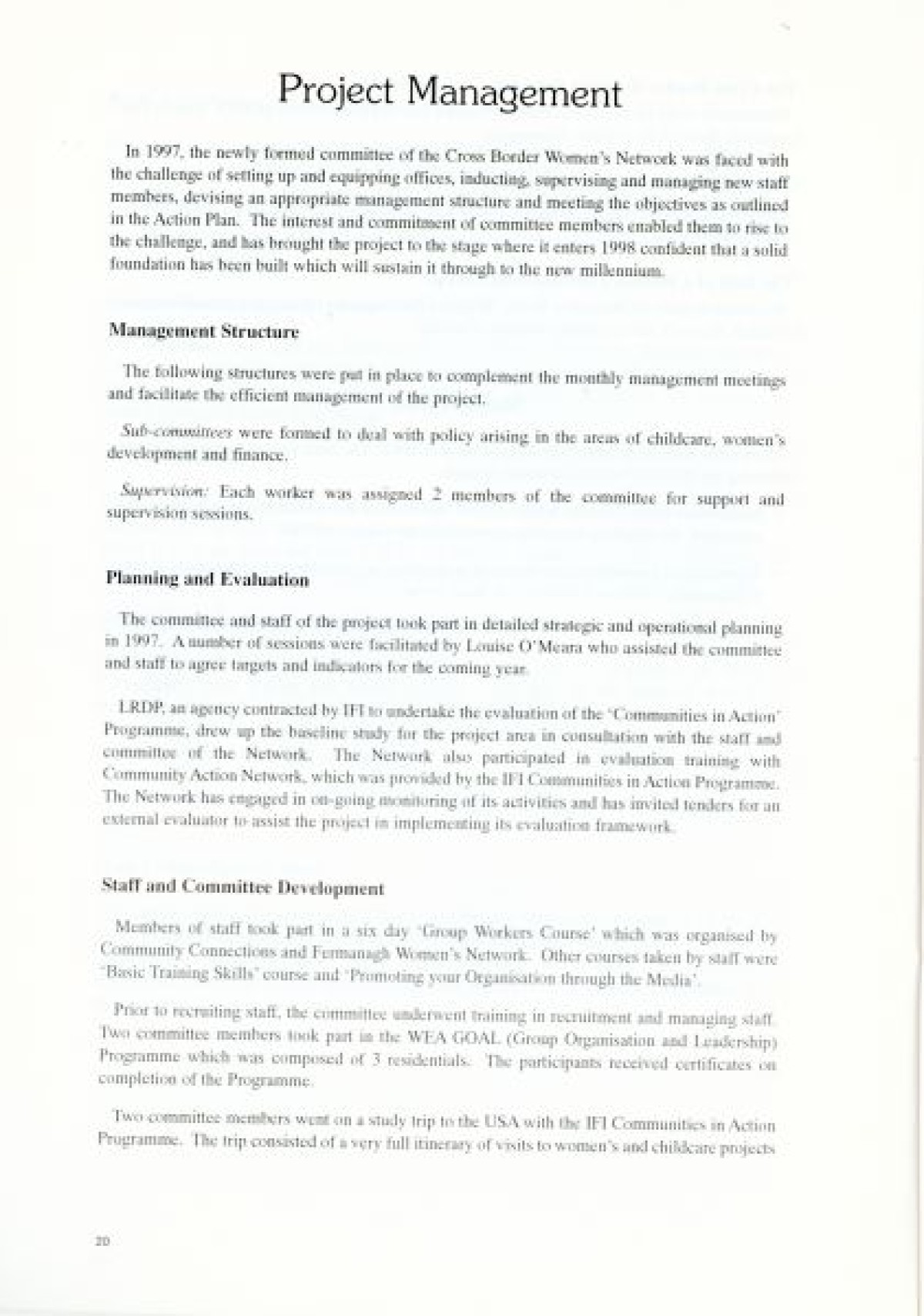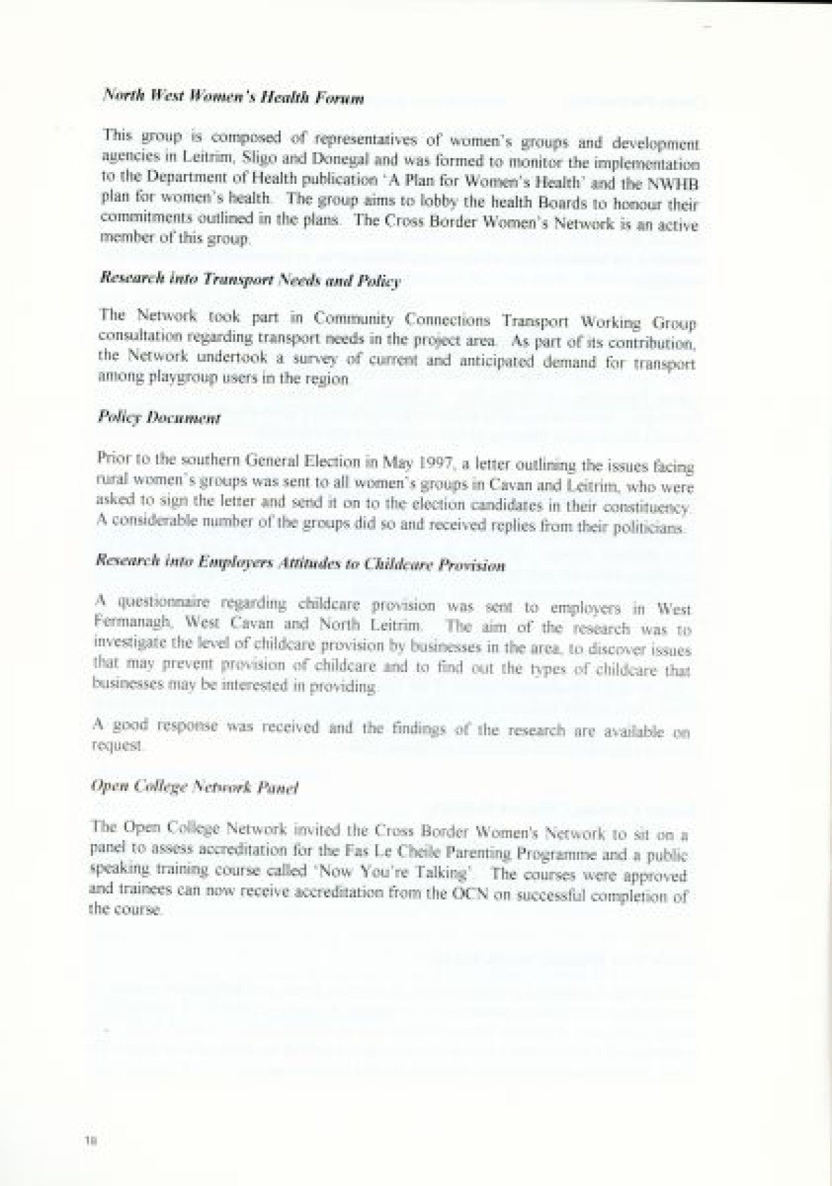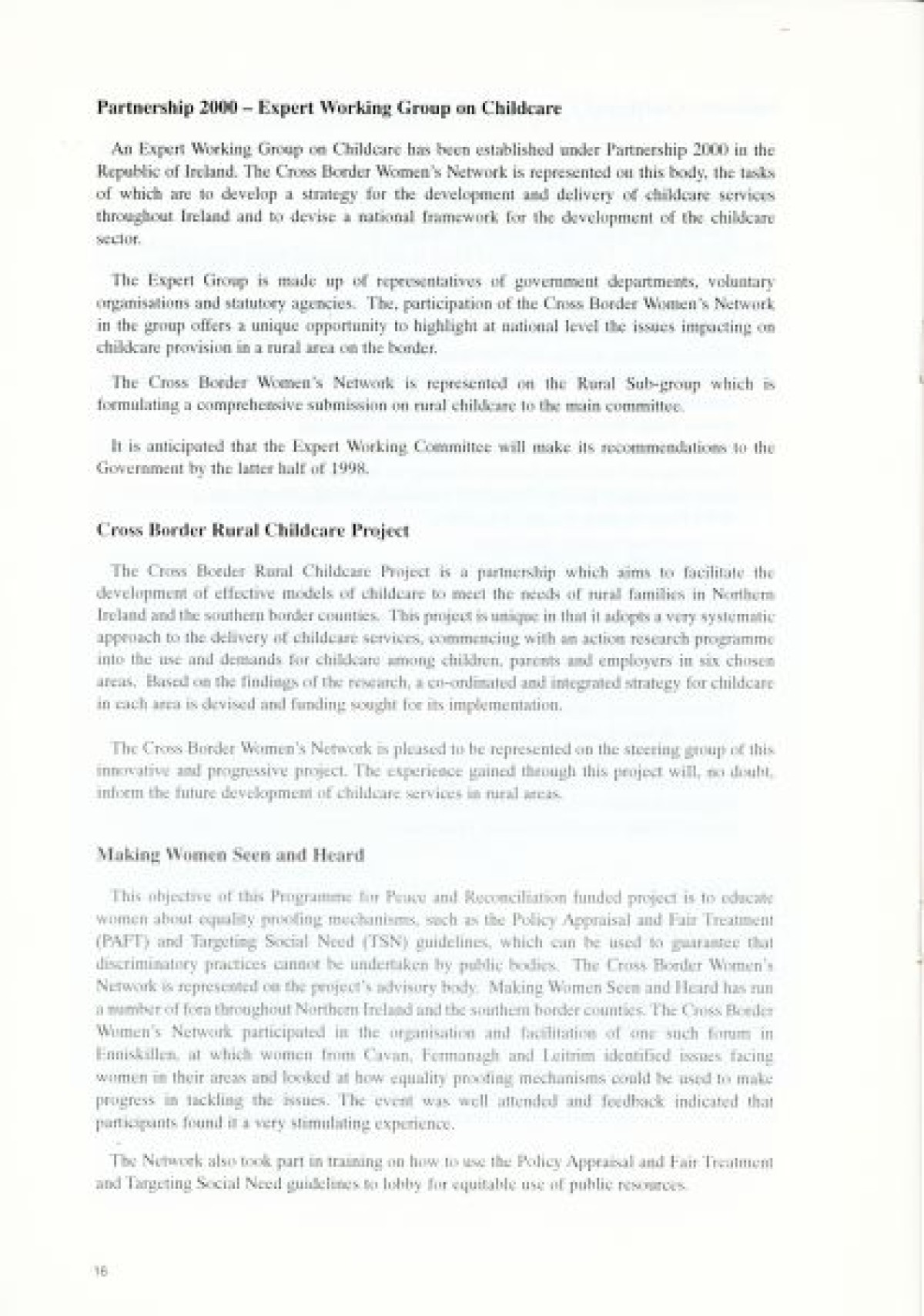 Cross Border Women’s Network; Report on local development work, including development of new women's groups and childcare initiatives; Information Provision via resources and seminars; Project Management, including structure, staff development, planning, evaluation, and public relations; details regarding networks and project collaboration; and Financial Statements.