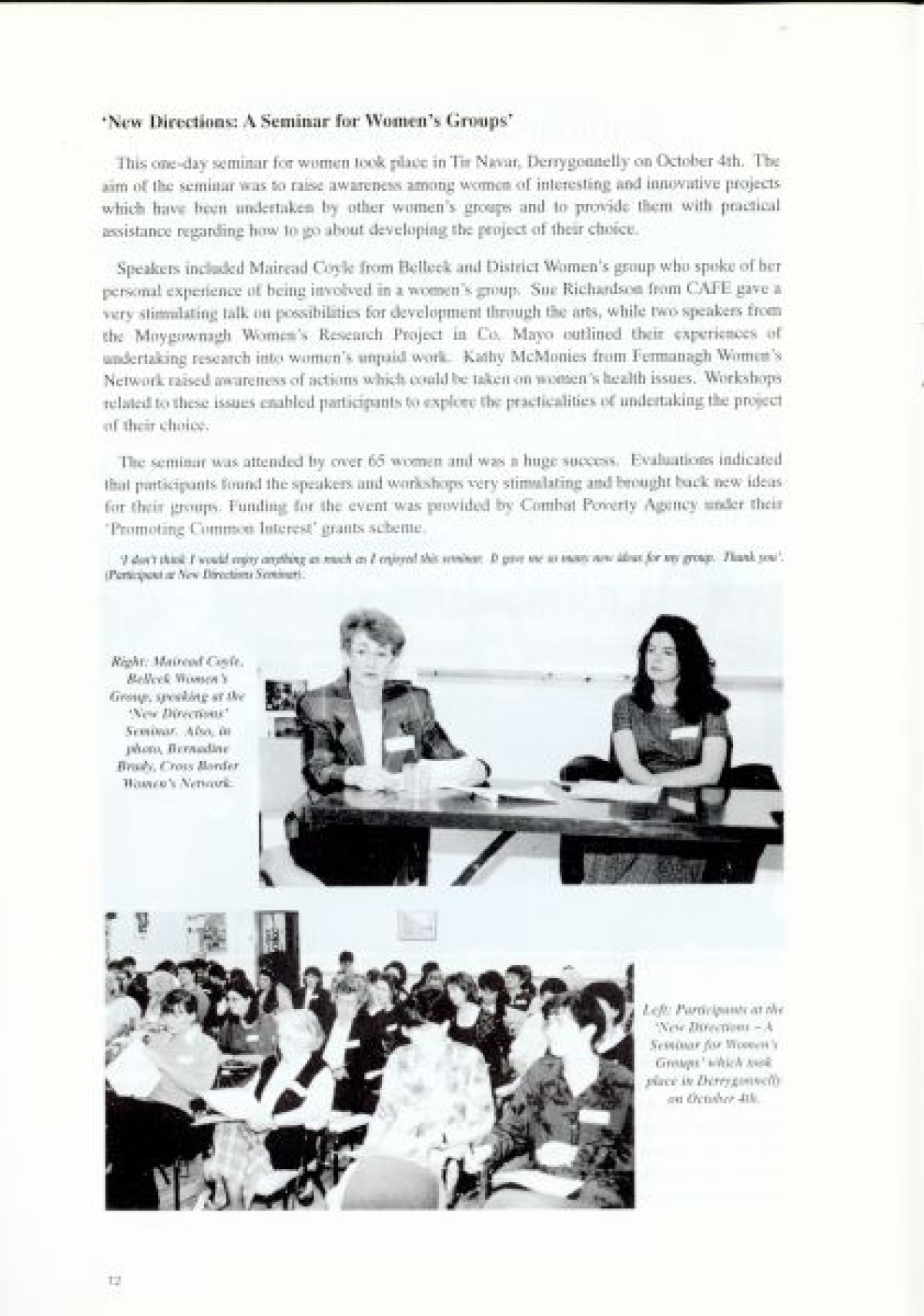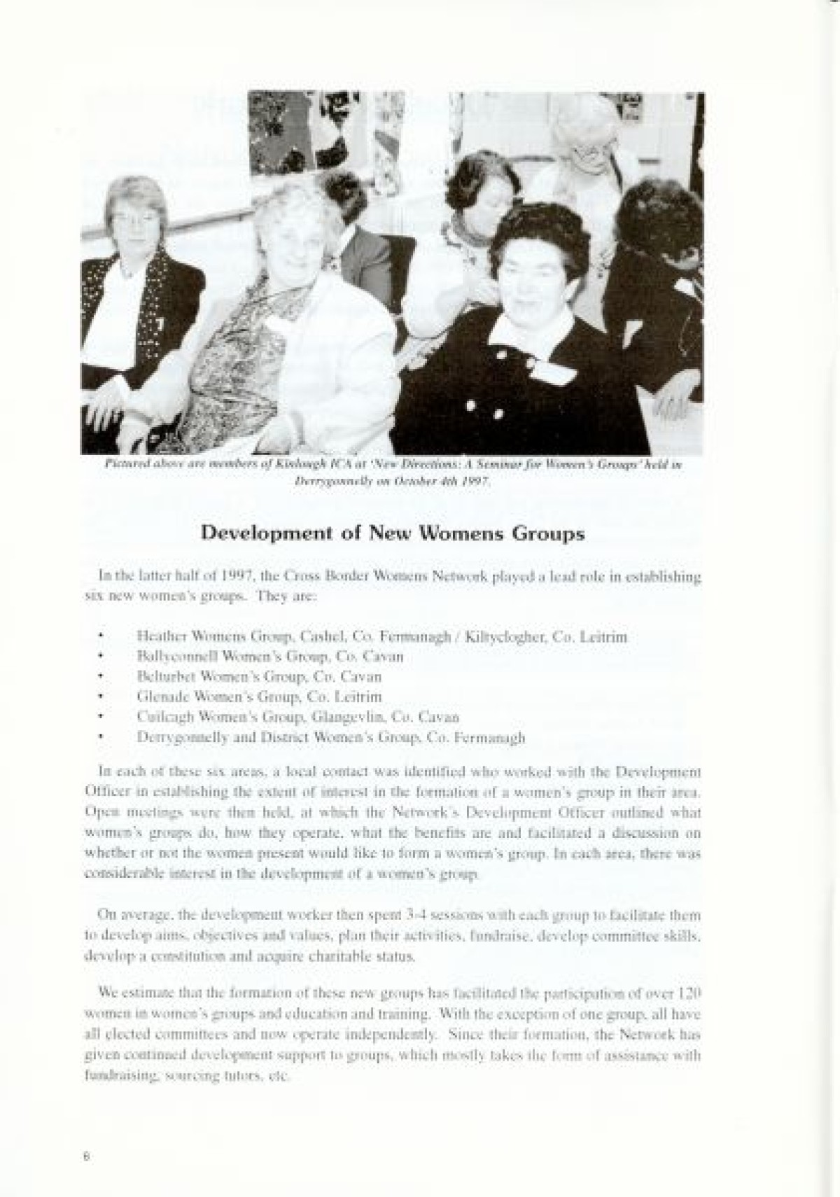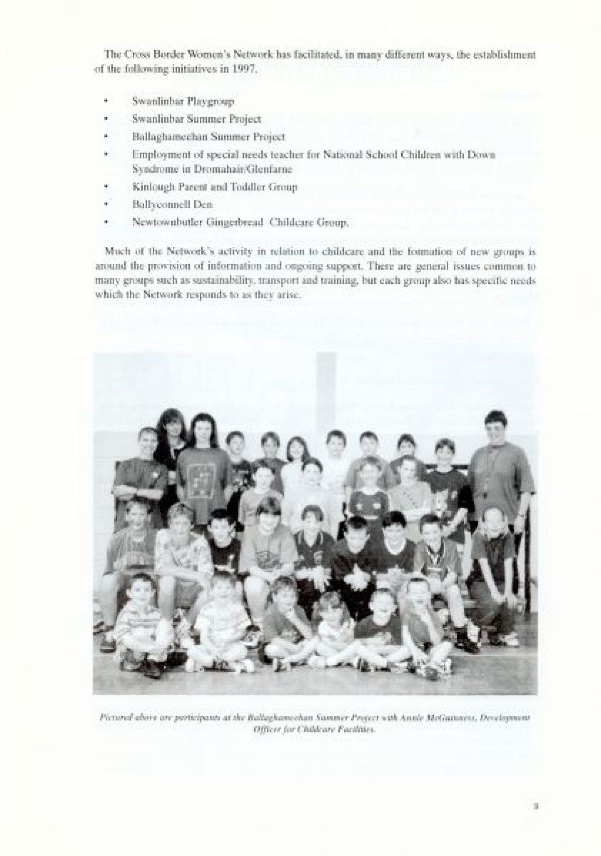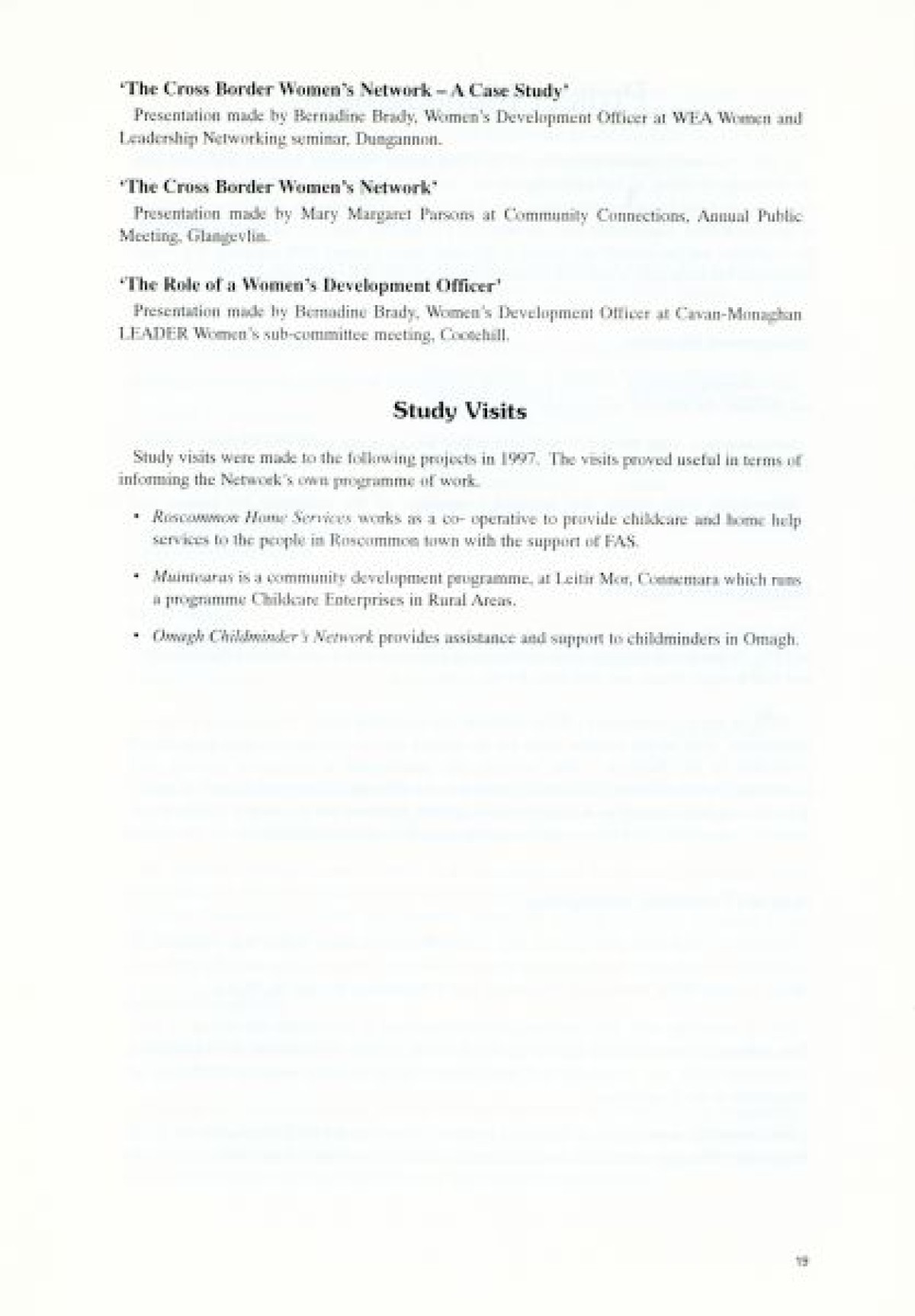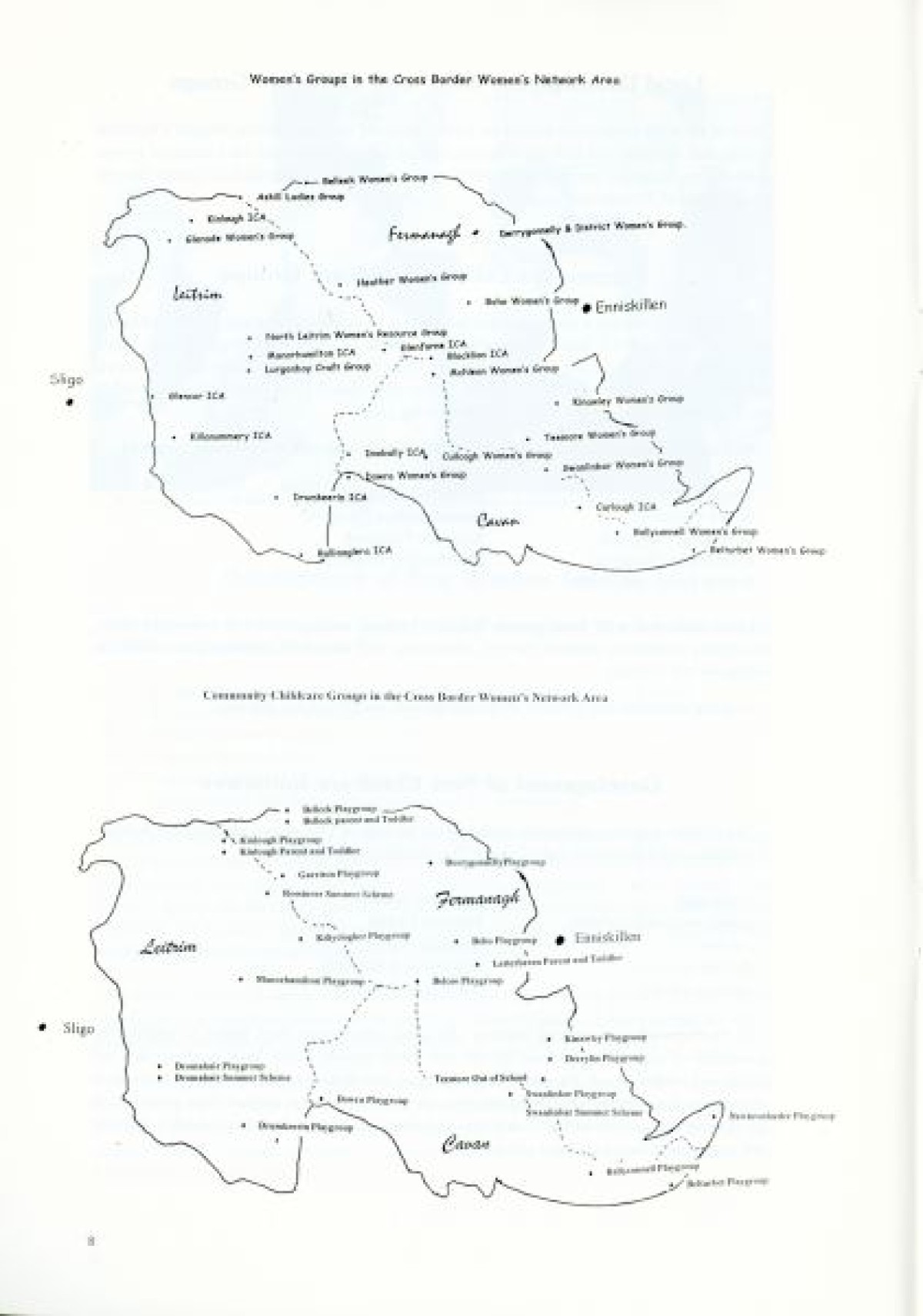 Cross Border Women’s Network; Report on local development work, including development of new women's groups and childcare initiatives; Information Provision via resources and seminars; Project Management, including structure, staff development, planning, evaluation, and public relations; details regarding networks and project collaboration; and Financial Statements.