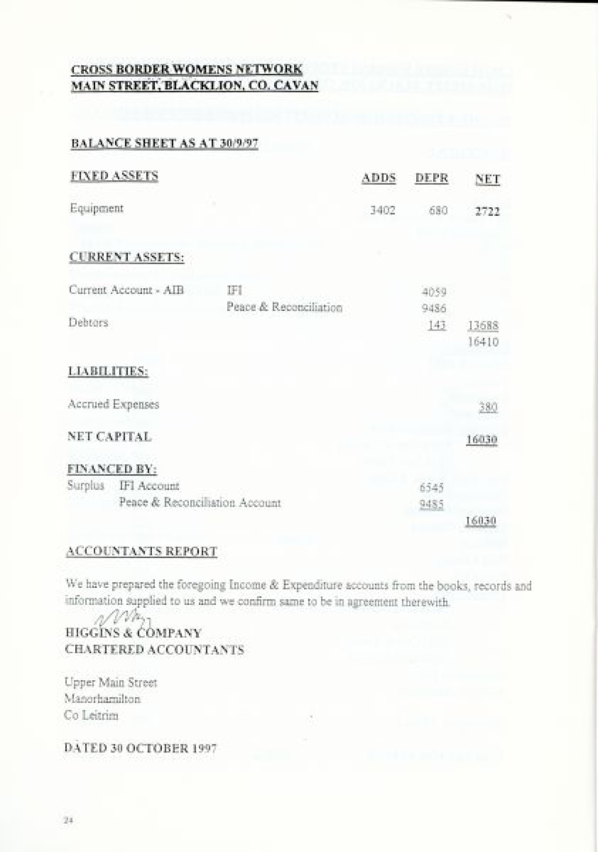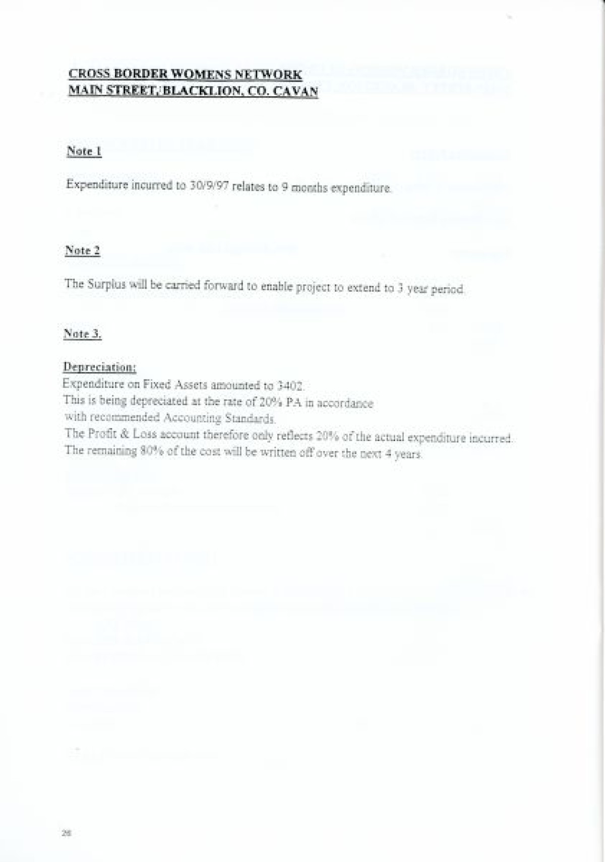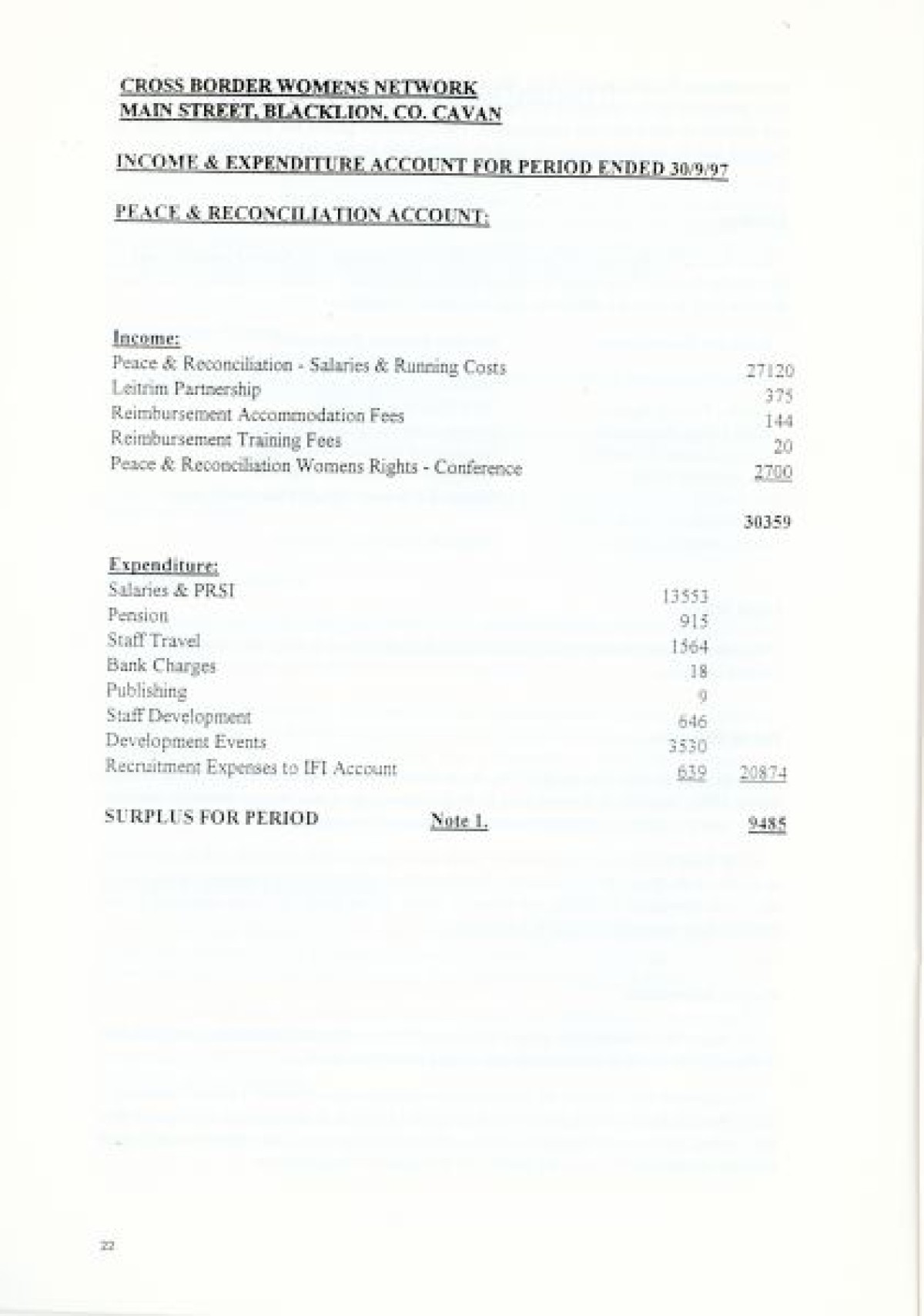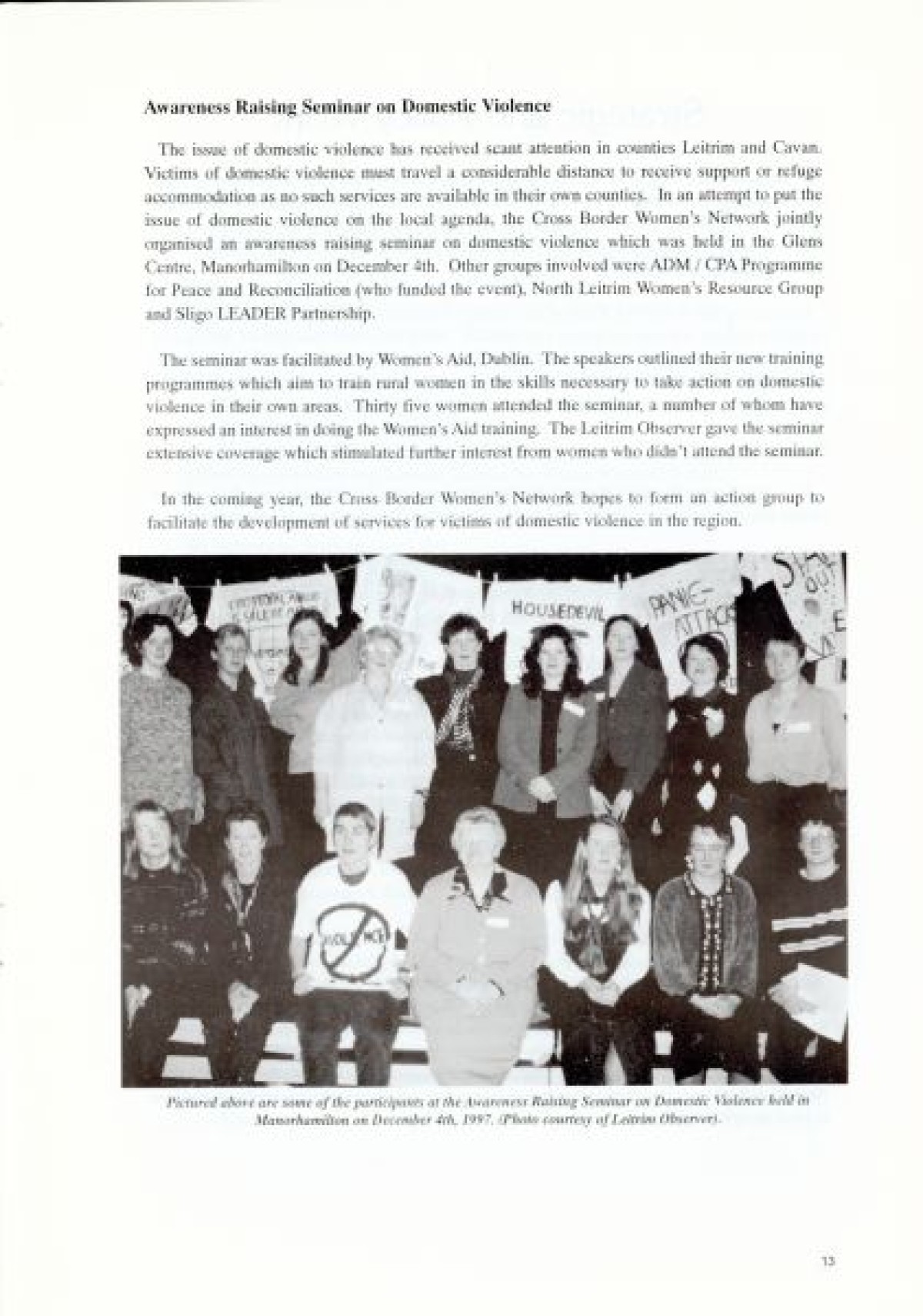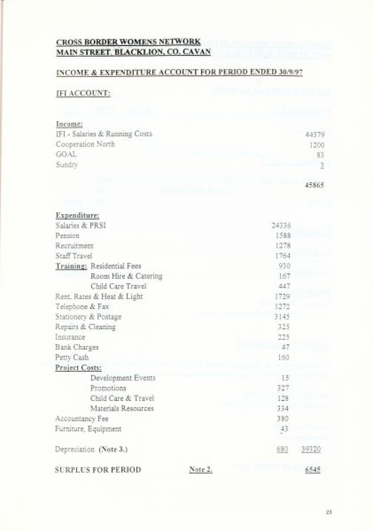 Cross Border Women’s Network; Report on local development work, including development of new women's groups and childcare initiatives; Information Provision via resources and seminars; Project Management, including structure, staff development, planning, evaluation, and public relations; details regarding networks and project collaboration; and Financial Statements.