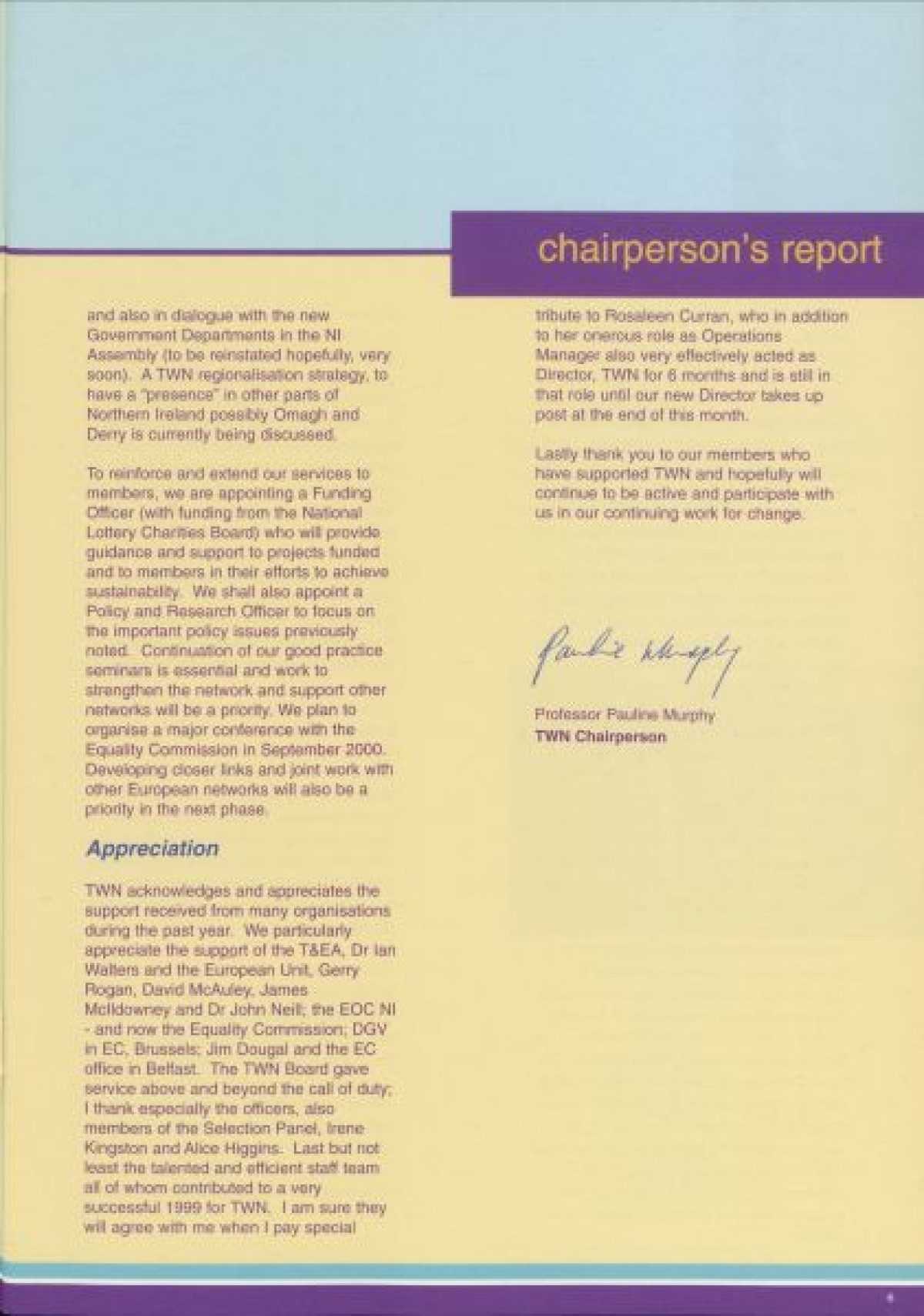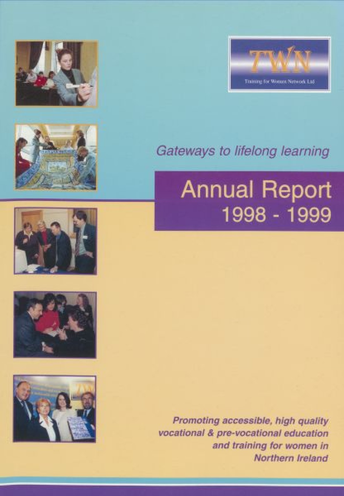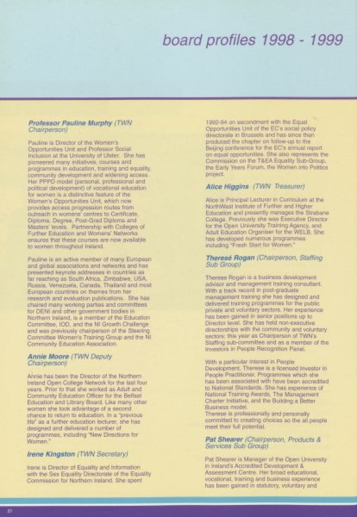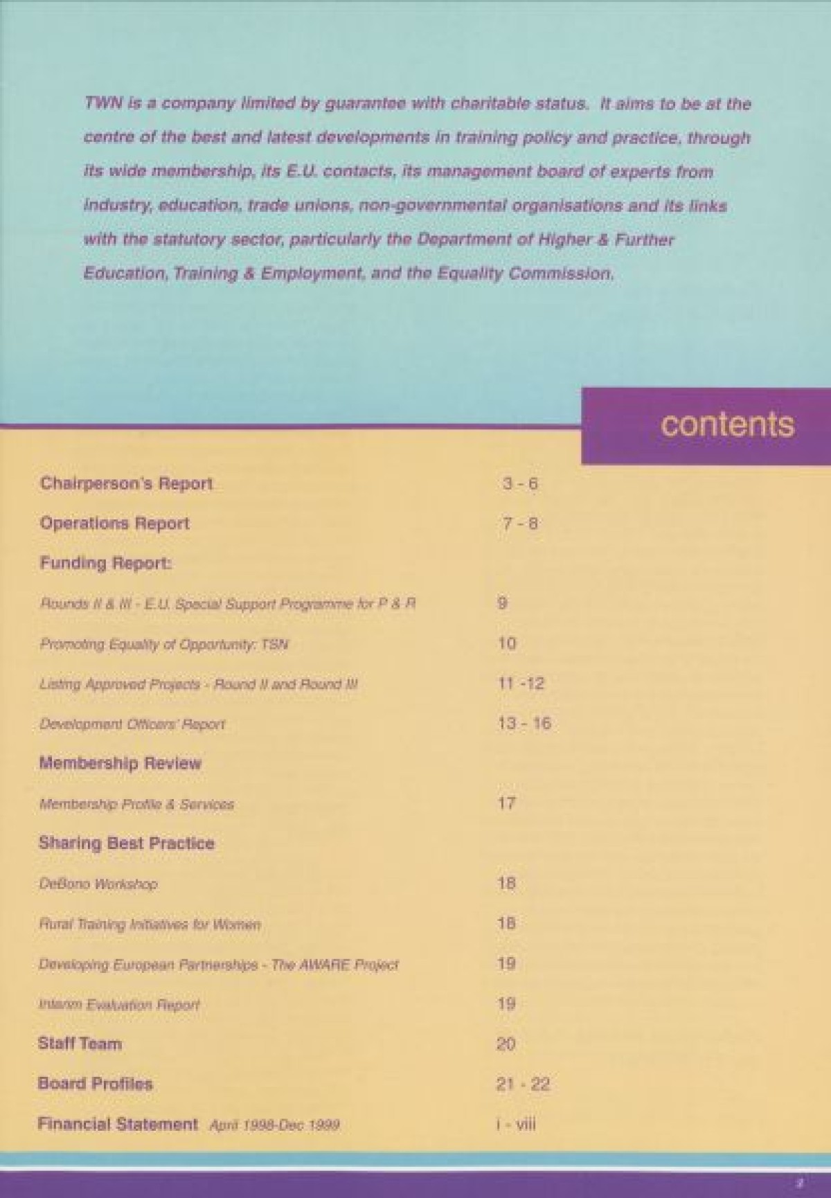 Annual Report, 1998-1999 . Contents include a chairperson's report from Prof Pauline Murphy, Operations report by Assistant Director Rosaleen Curran, funding report, membership review, report on sharing best practice, staff team, board profiles and a financial statement from April 1998- Dec 1999.