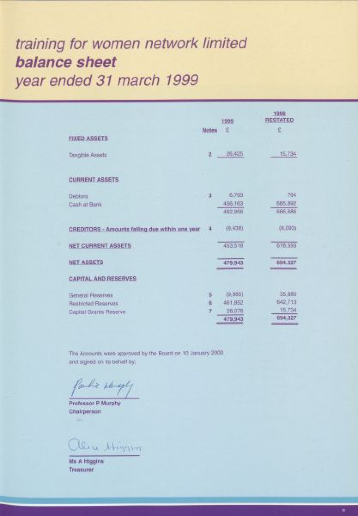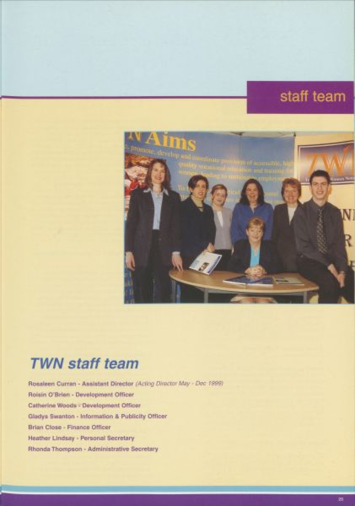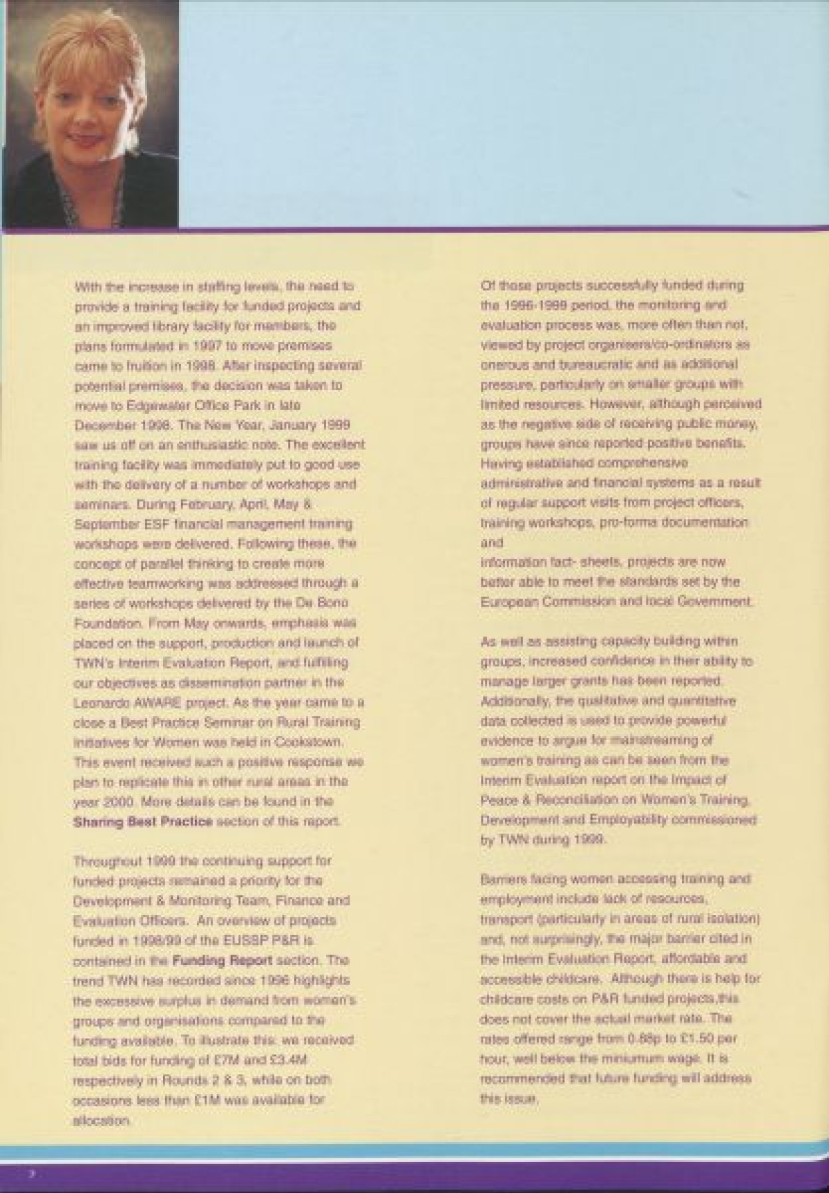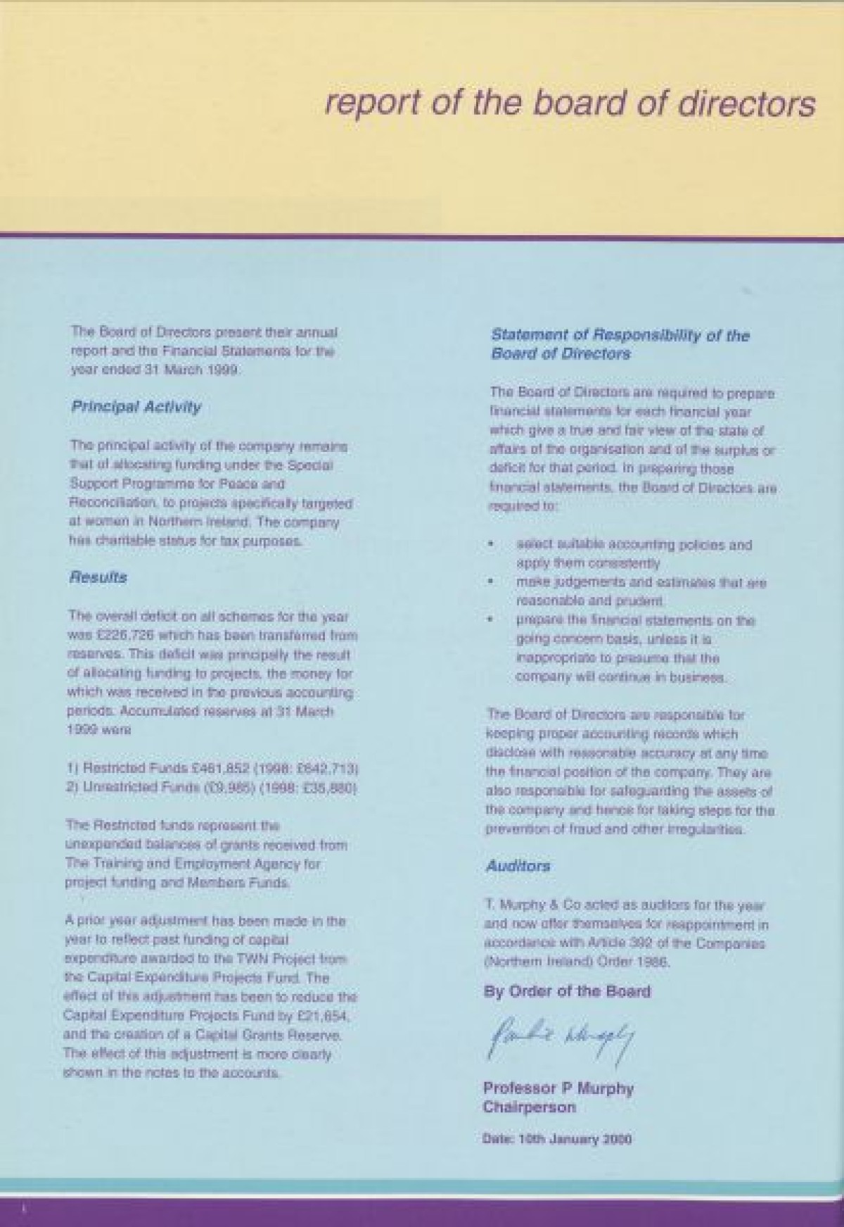 Annual Report, 1998-1999 . Contents include a chairperson's report from Prof Pauline Murphy, Operations report by Assistant Director Rosaleen Curran, funding report, membership review, report on sharing best practice, staff team, board profiles and a financial statement from April 1998- Dec 1999.