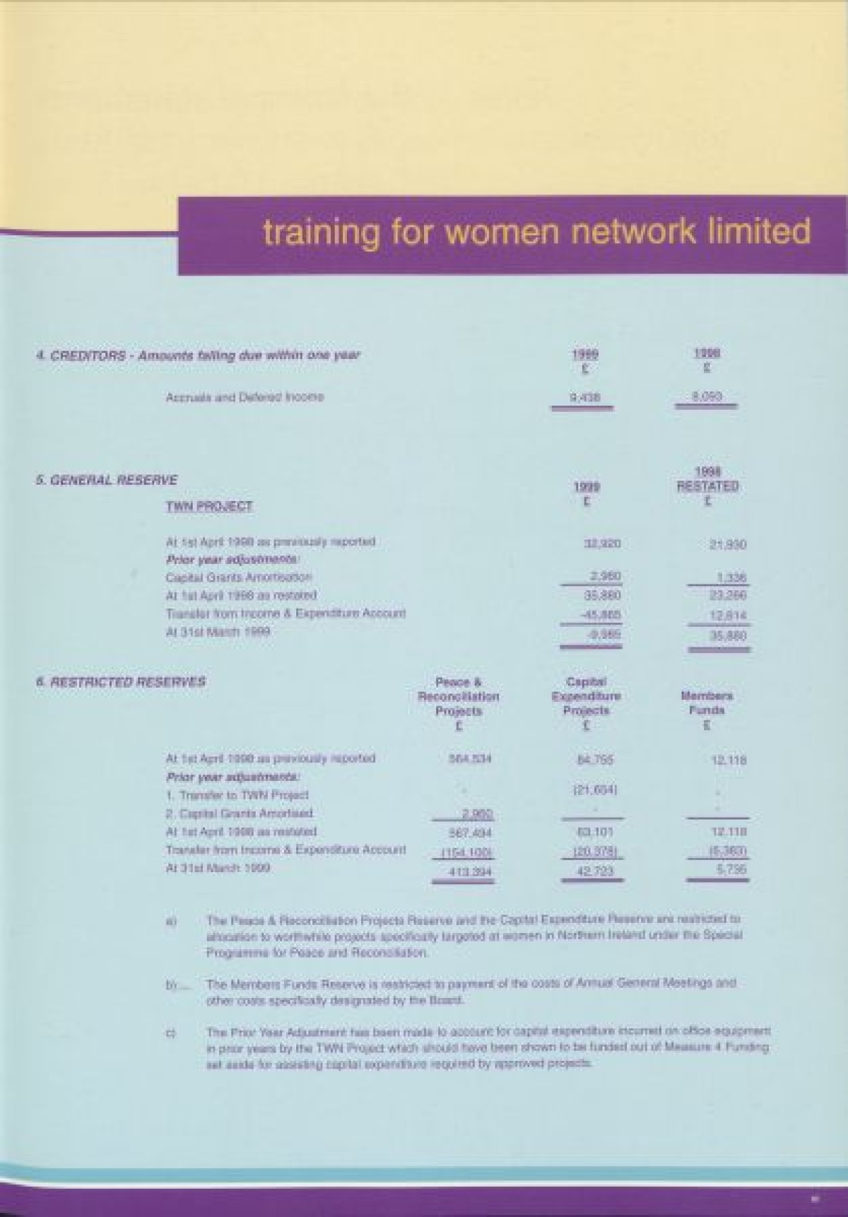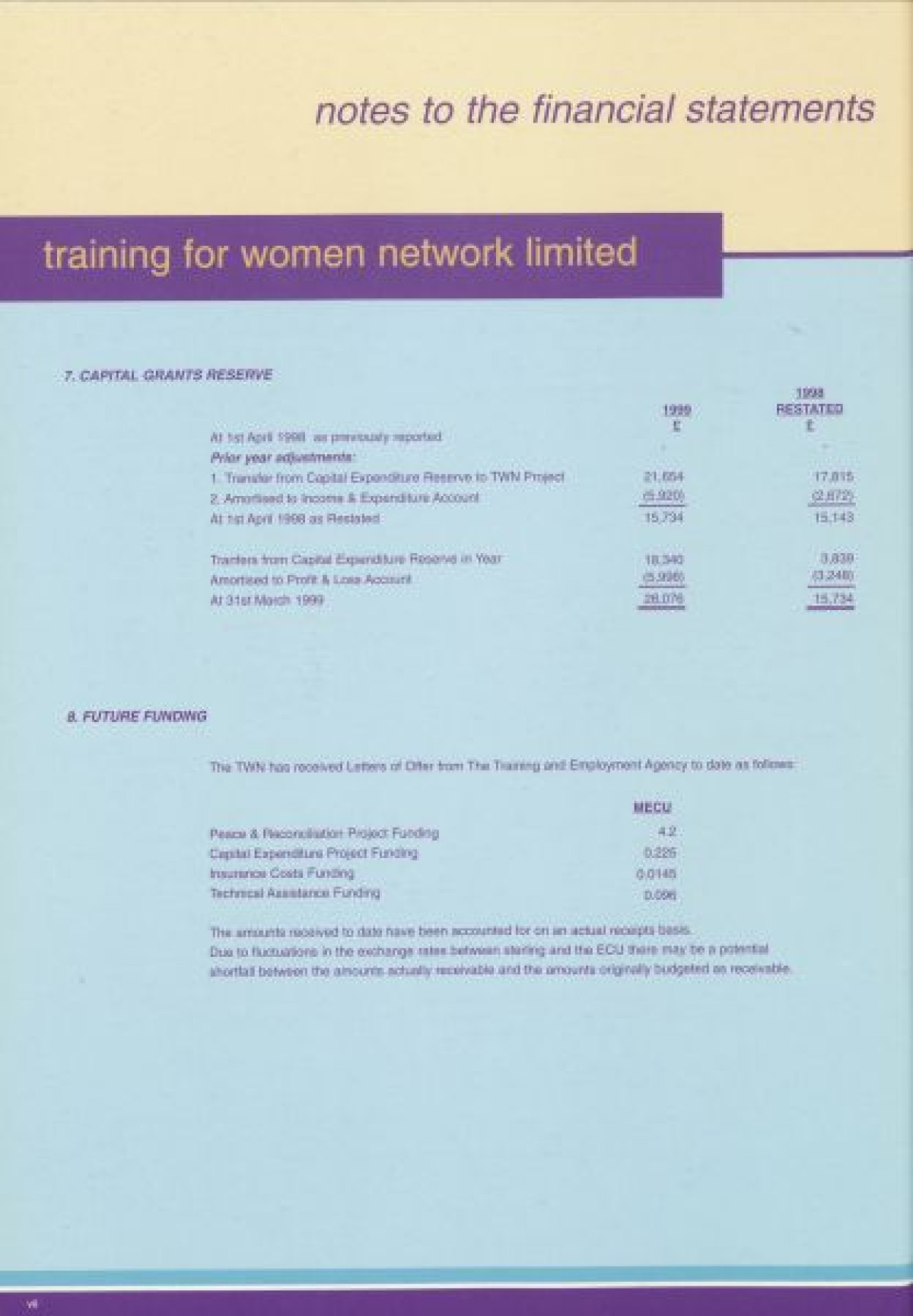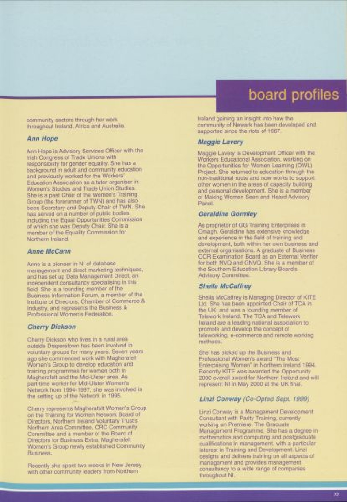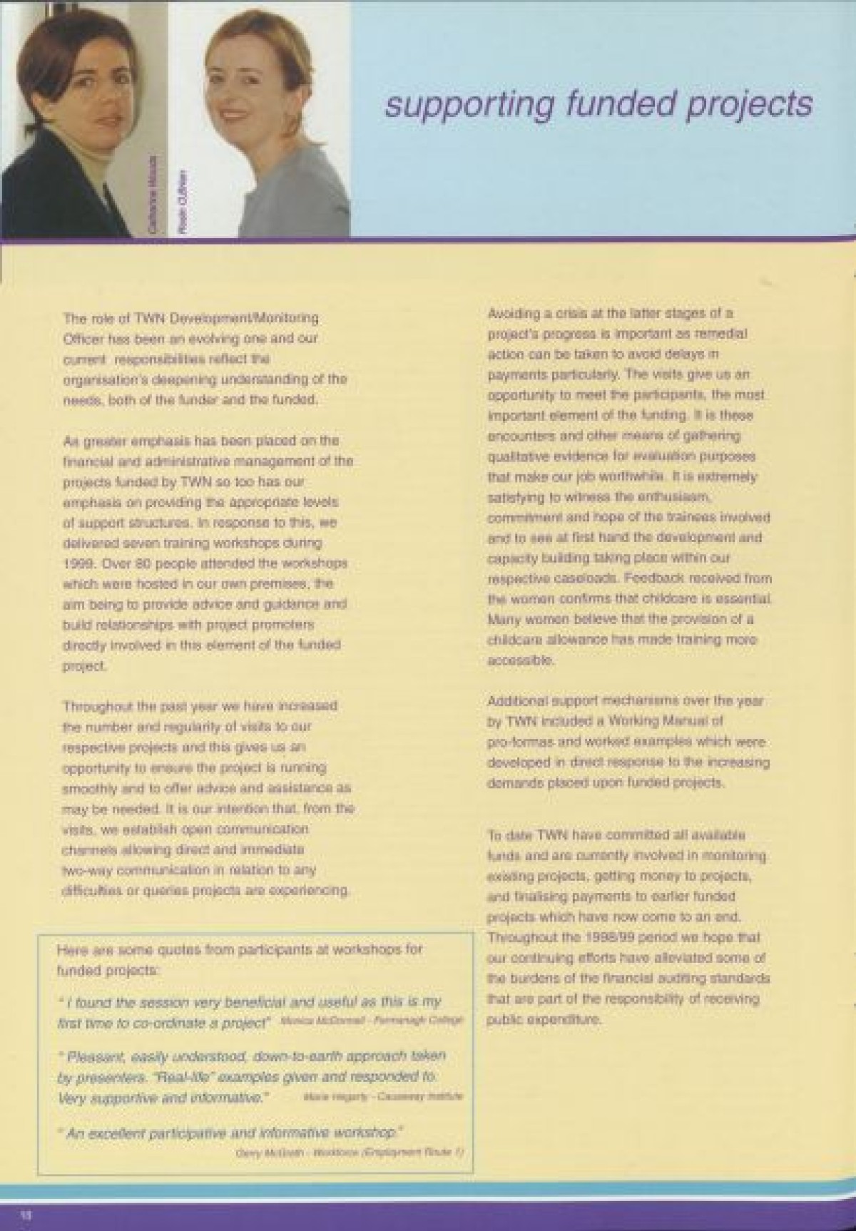 Annual Report, 1998-1999 . Contents include a chairperson's report from Prof Pauline Murphy, Operations report by Assistant Director Rosaleen Curran, funding report, membership review, report on sharing best practice, staff team, board profiles and a financial statement from April 1998- Dec 1999.