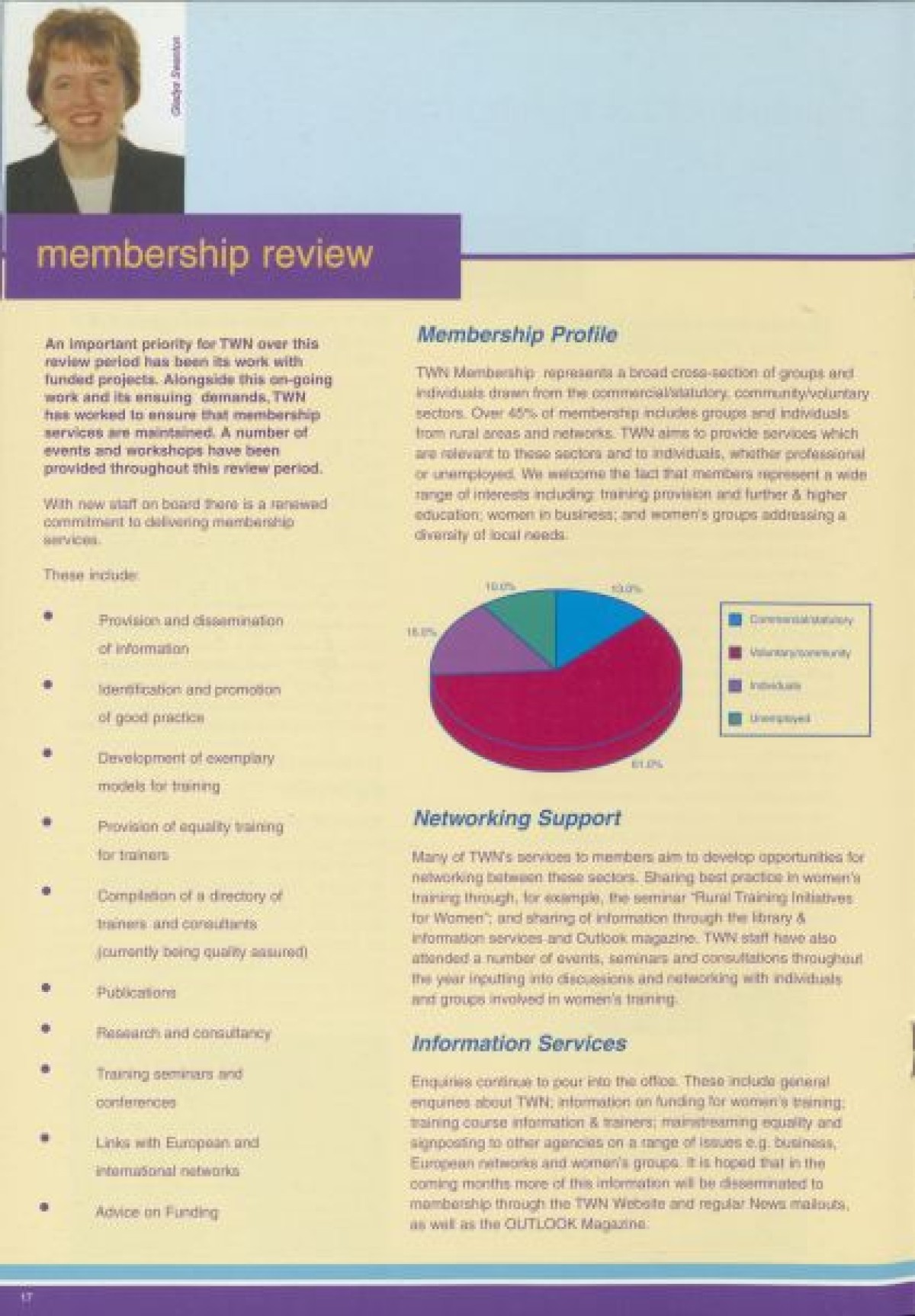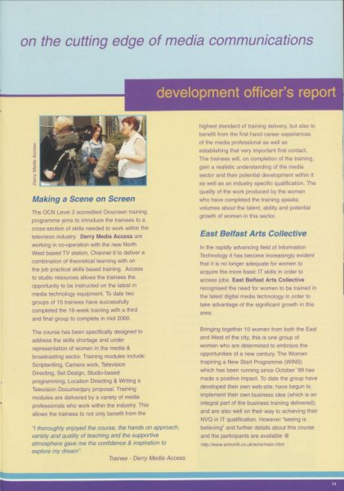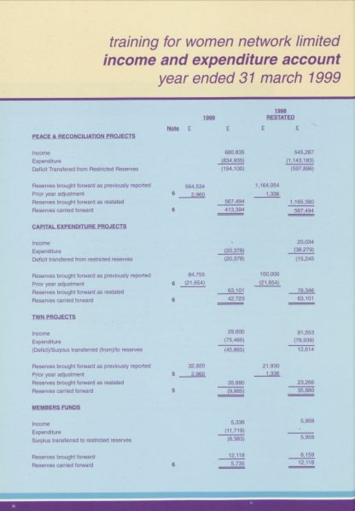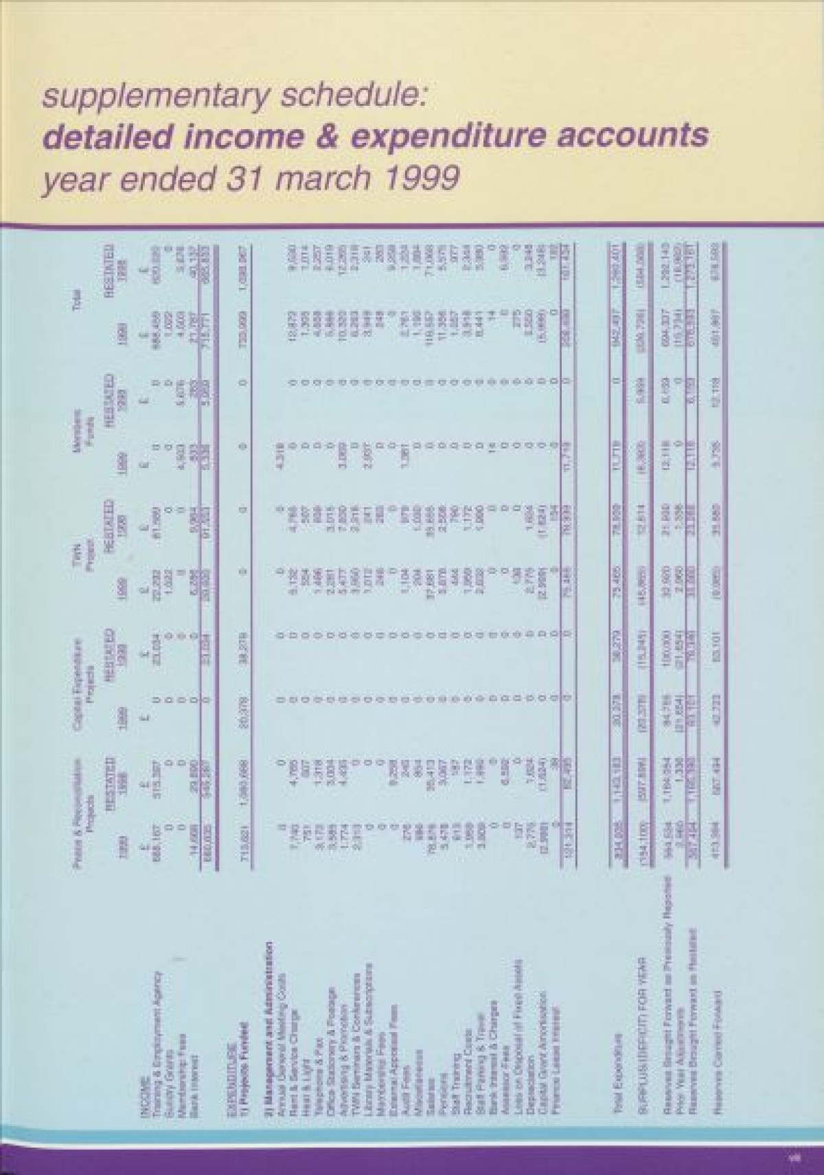 Annual Report, 1998-1999 . Contents include a chairperson's report from Prof Pauline Murphy, Operations report by Assistant Director Rosaleen Curran, funding report, membership review, report on sharing best practice, staff team, board profiles and a financial statement from April 1998- Dec 1999.