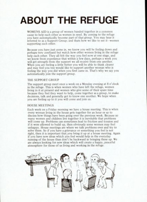 Leaflet produced by Belfast Women's Aid, containing information about the Women's Aid organisation, a weekly support group, house meetings, house rules, and financial support.