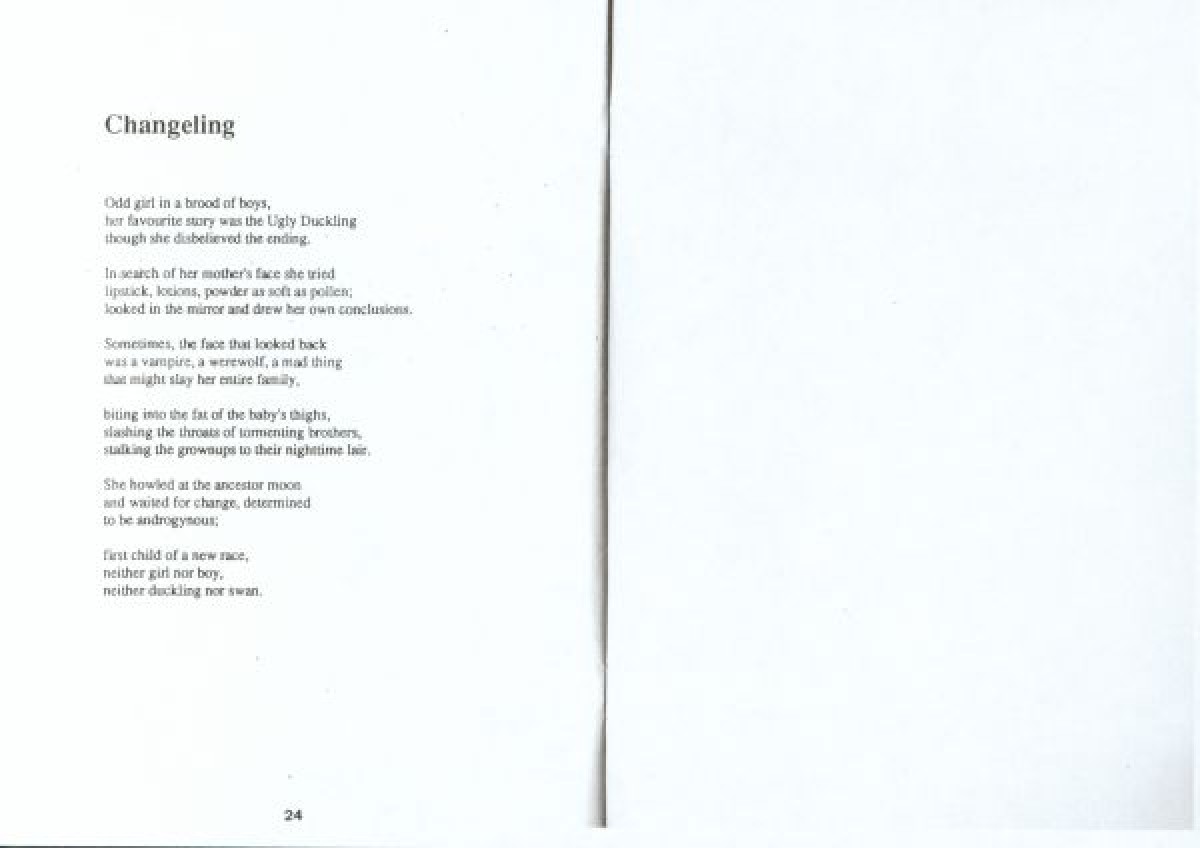 Falls Women's Centre. Includes a black and white illustrated cover by an anonymous friend in London. Contents include: Some mornings; The mind retains; Banshee in the office; Claiming; Requiem for a school; Resistance two-step; The Dungloe Road; My mother's; Sustenance; Stranger; Afterbirth; Daughter, grown; Invaders; Herself; First fire; and Changeling.
