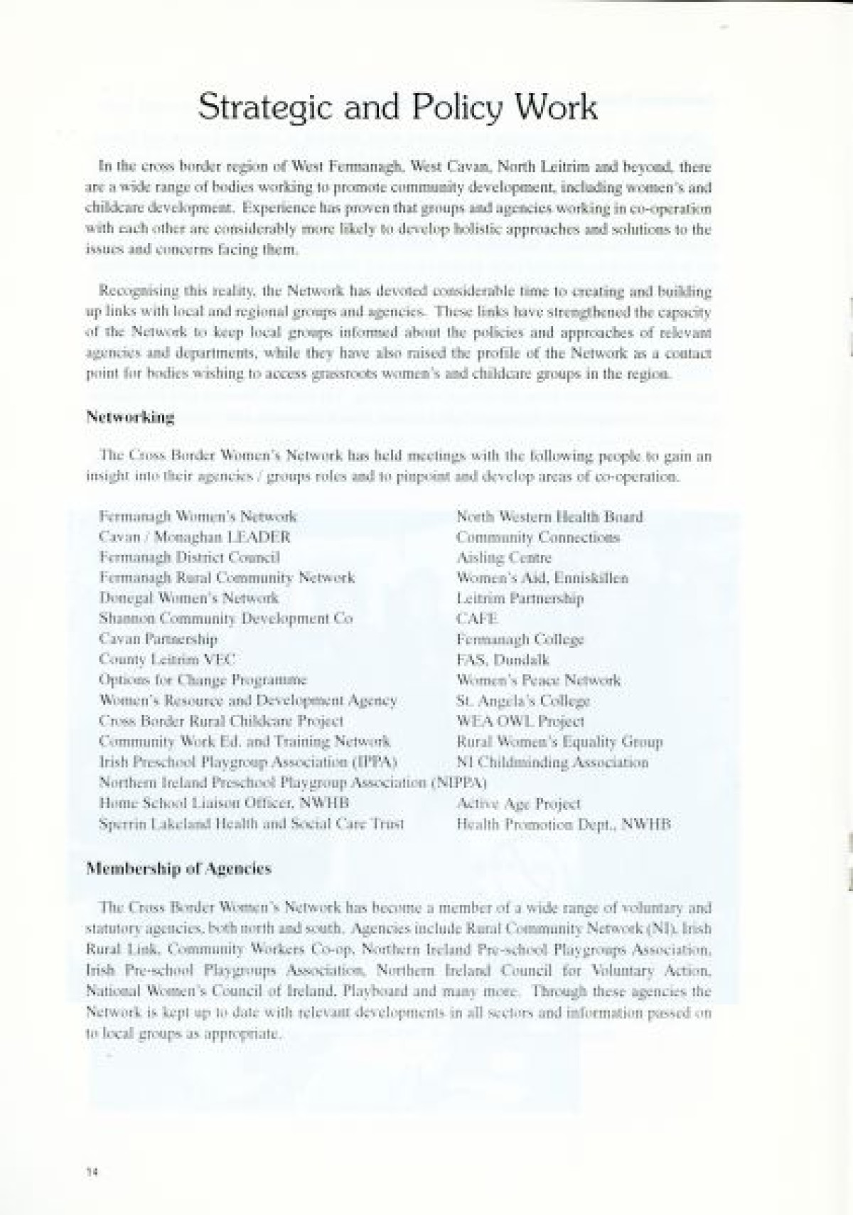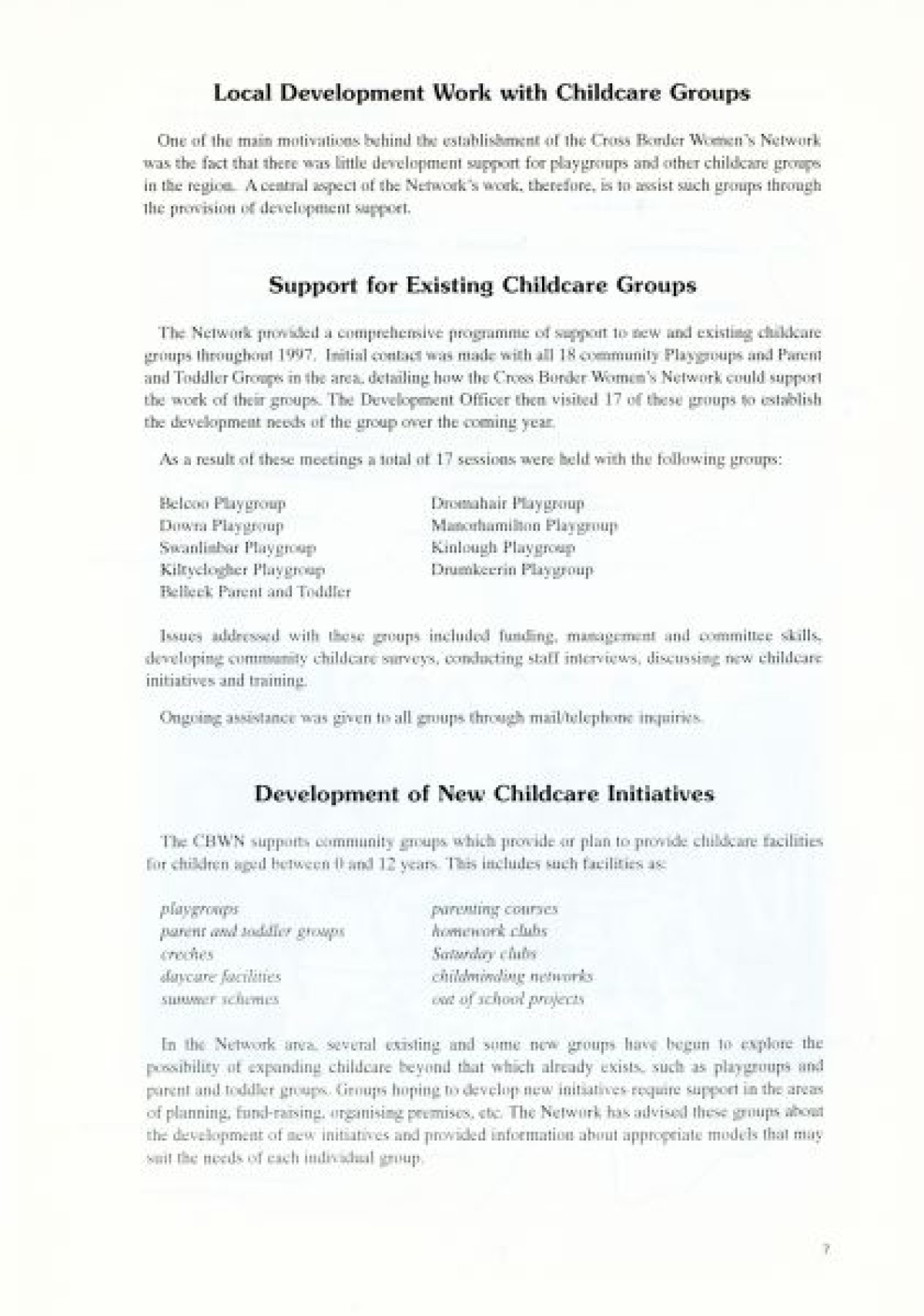 Cross Border Women’s Network; Report on local development work, including development of new women's groups and childcare initiatives; Information Provision via resources and seminars; Project Management, including structure, staff development, planning, evaluation, and public relations; details regarding networks and project collaboration; and Financial Statements.