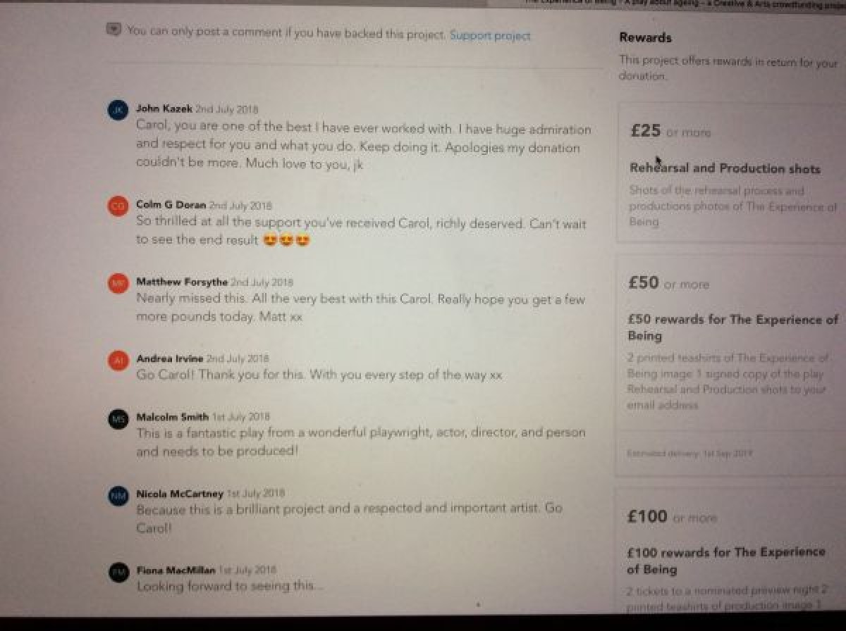 Digital crowd funding appeal by Carol Moore, seeking support to commission a music score and continued physical development with a choreographer for her one-woman play, "The Experience of Being." The screen shot taken from crowdfunder.co.uk shows a still image from a video, featuring the artist with a bag on her head and a notification announcing the successful achievement of £4,160 raised over a 35 day period by 2nd July 2018. Also includes a list of public comments from Carol Moore's supporters.