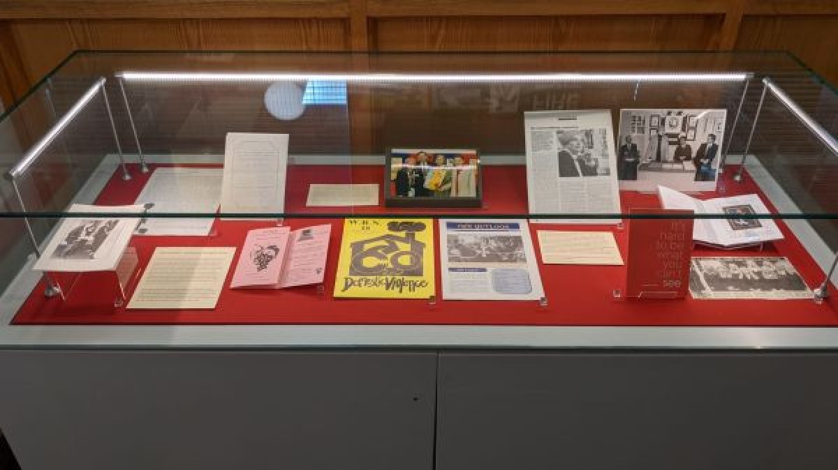 Northern Ireland Community Education Association (NICEA) which she founded in 1981. The display case also featured a selection of items from the Northern Ireland Political Collection at the Linen Hall Library, including documents donated by the Belfast Law Centre, the Vine centre, and 'Women in Law,' a project by photographer Susie Rea.