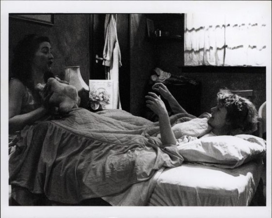 Black and white photograph of Eleanor Methven and Carol Moore playing with a teddy bear in bed, during a scene from