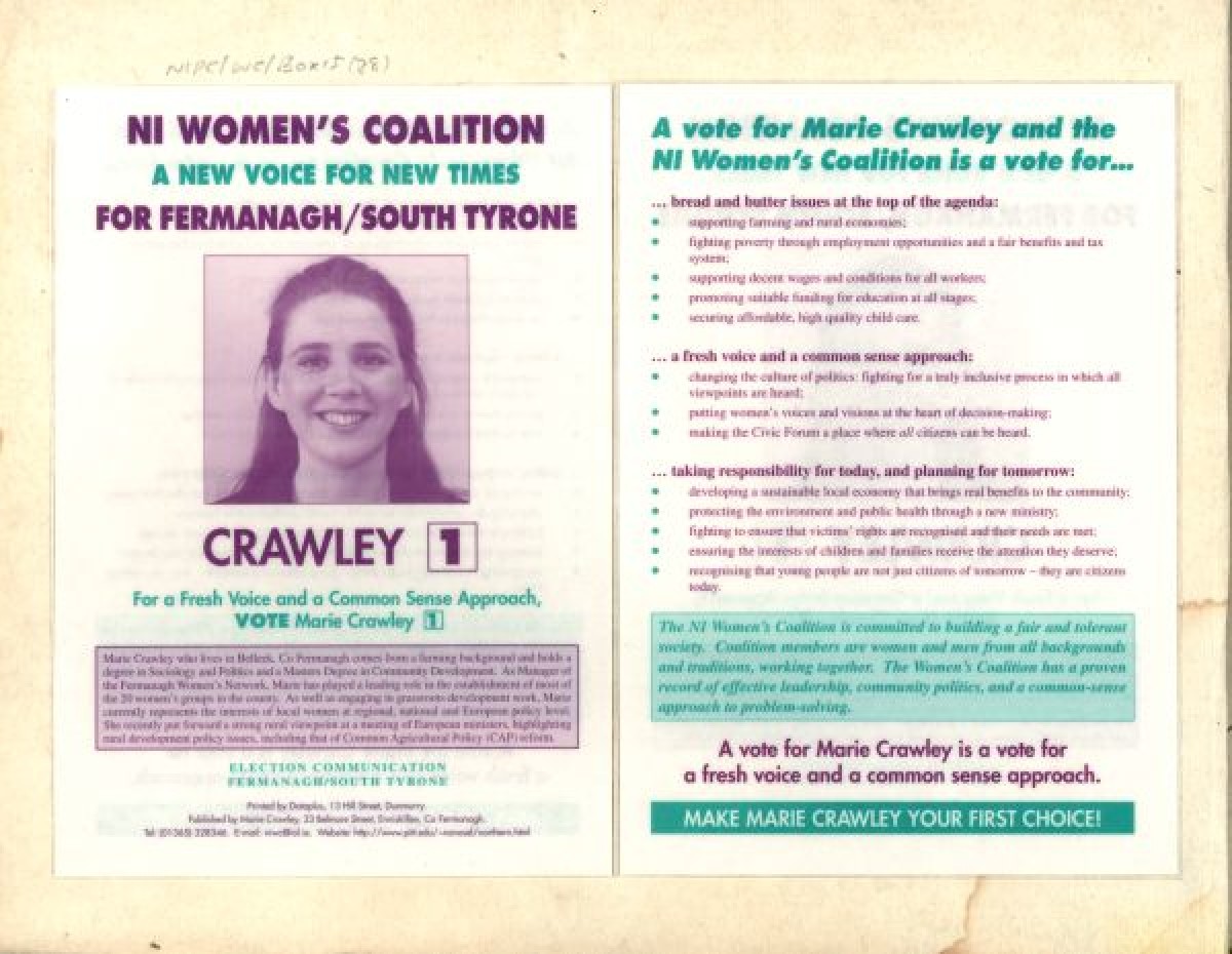 Election flyers x 2 for Marie Crawley, laminated, titled 'A New Voice for New Times for Fermanagh/South Tyrone. Vote 1 Marie Crawley NI Women's Coalition', with further leaflet also titled 'NI Women's Coalition: A New Voice for New Times for Fermanagh/South Tyrone' with larger image of Crawley and details of her agenda. Both flyers are attached to a scrapbook created by Crawley featuring newspaper clippings, letters, cards and leaflets for Marie Crawley in the 1998 election, featuring poem by Audre Lorde on cover.