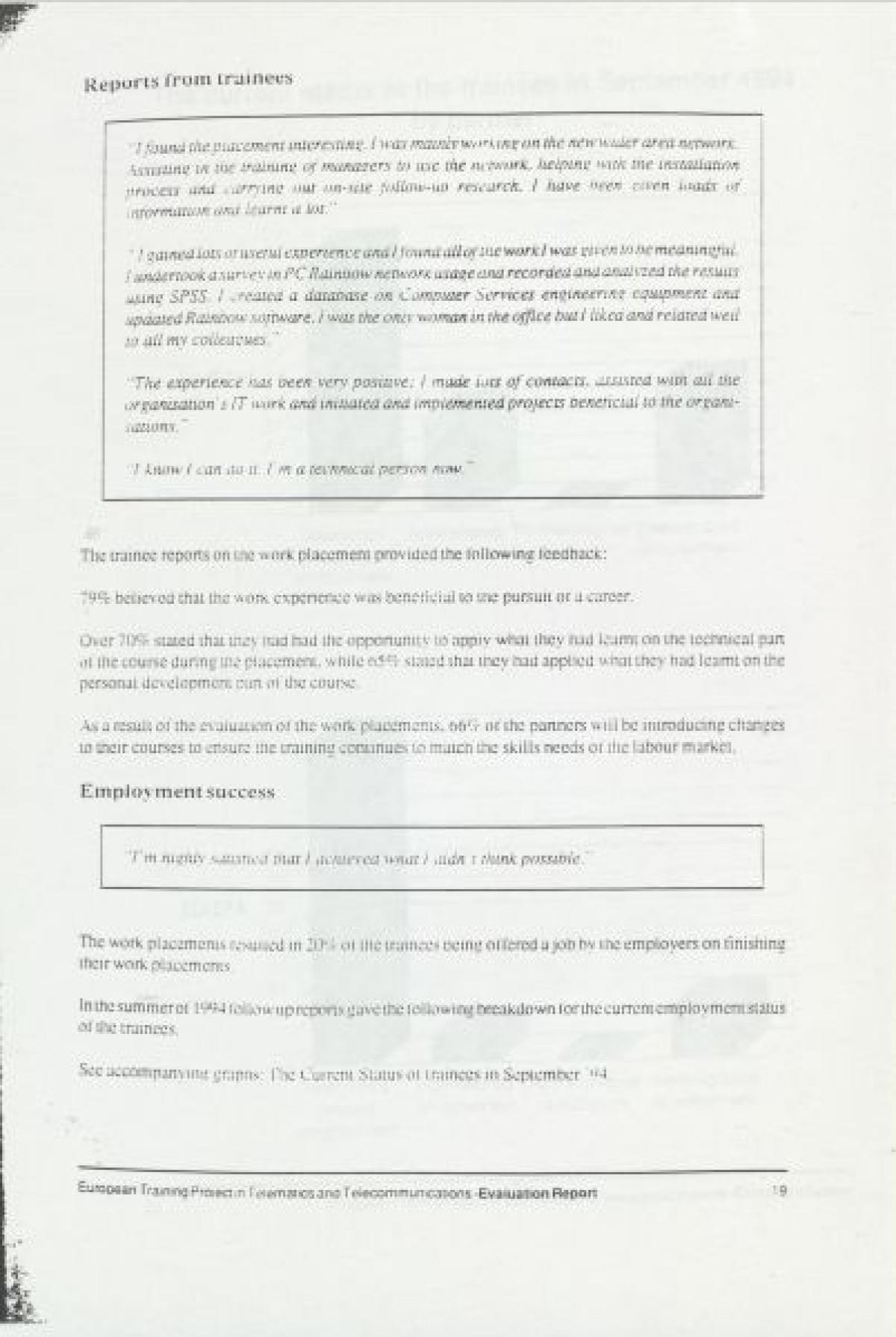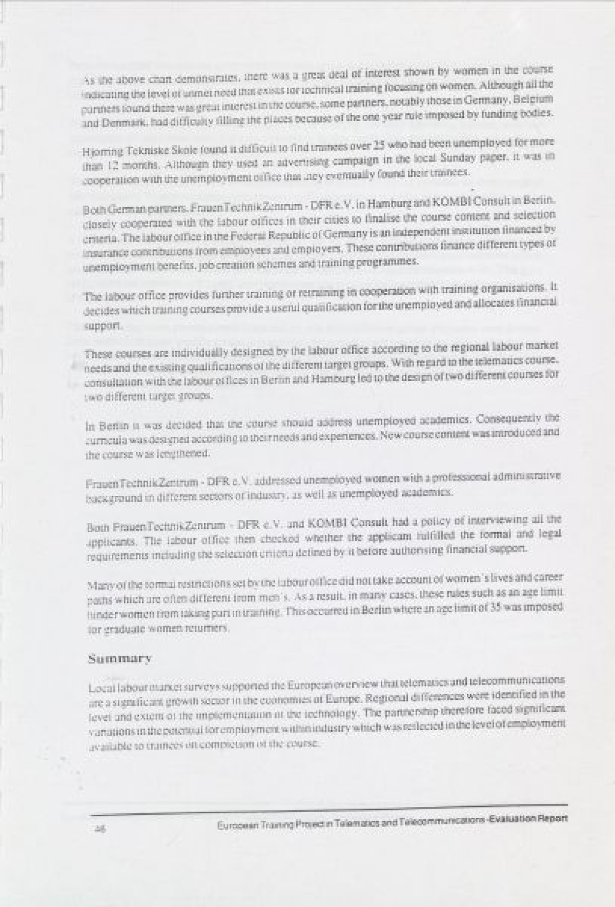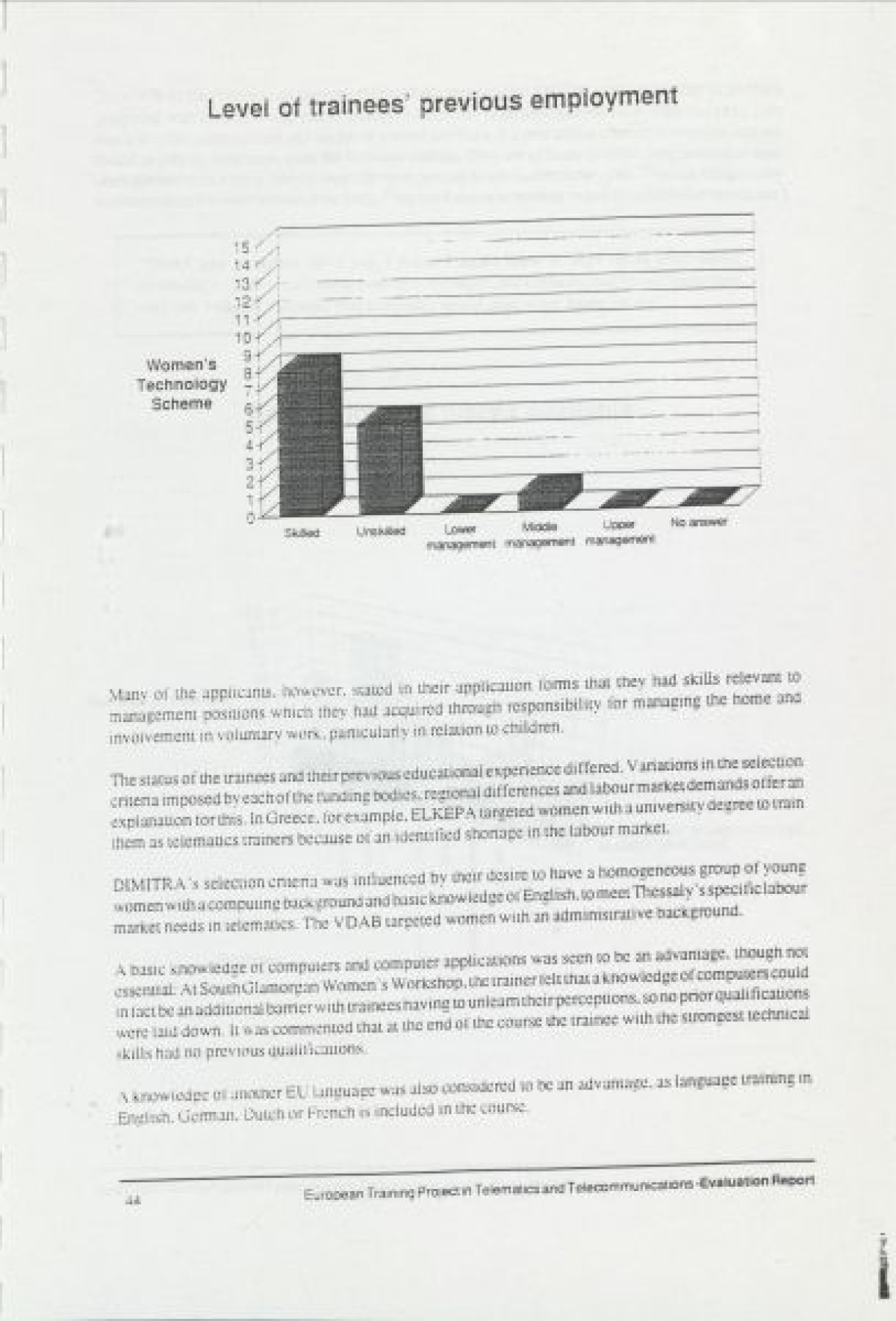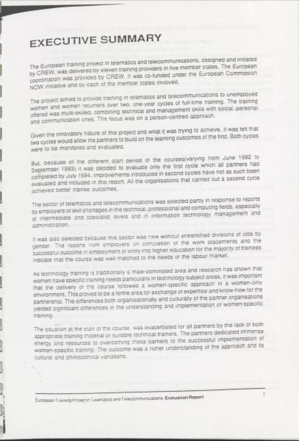 Pages from a report, containing an evaluation summary of a European project to train women in Telematics and Telecommunications. Includes an Executive Summary outlining a women's specific approach to training in technology; introduction and background to the project; reports from women trainees, graphs showing levels of previous employment; and a report on the effectiveness of the women friendly environment and support structures.