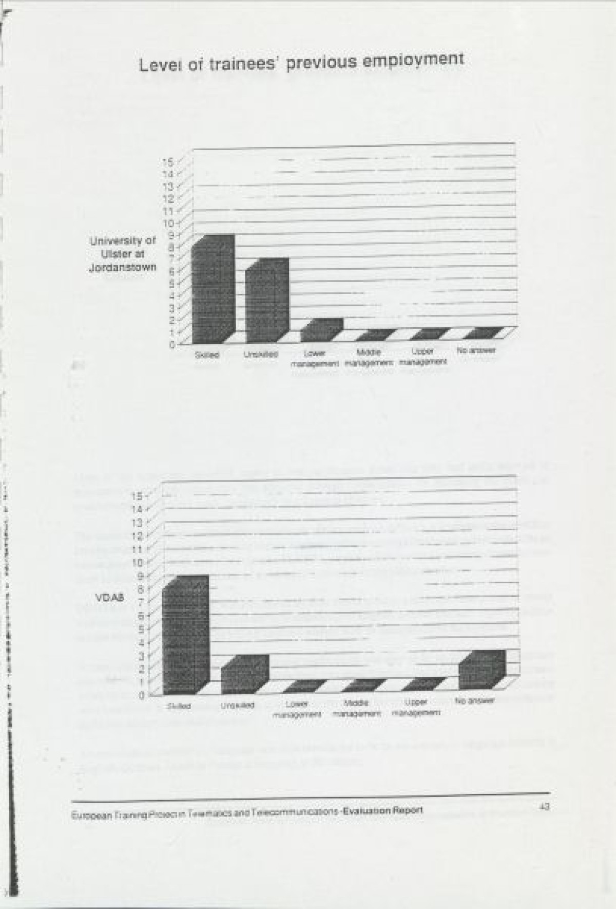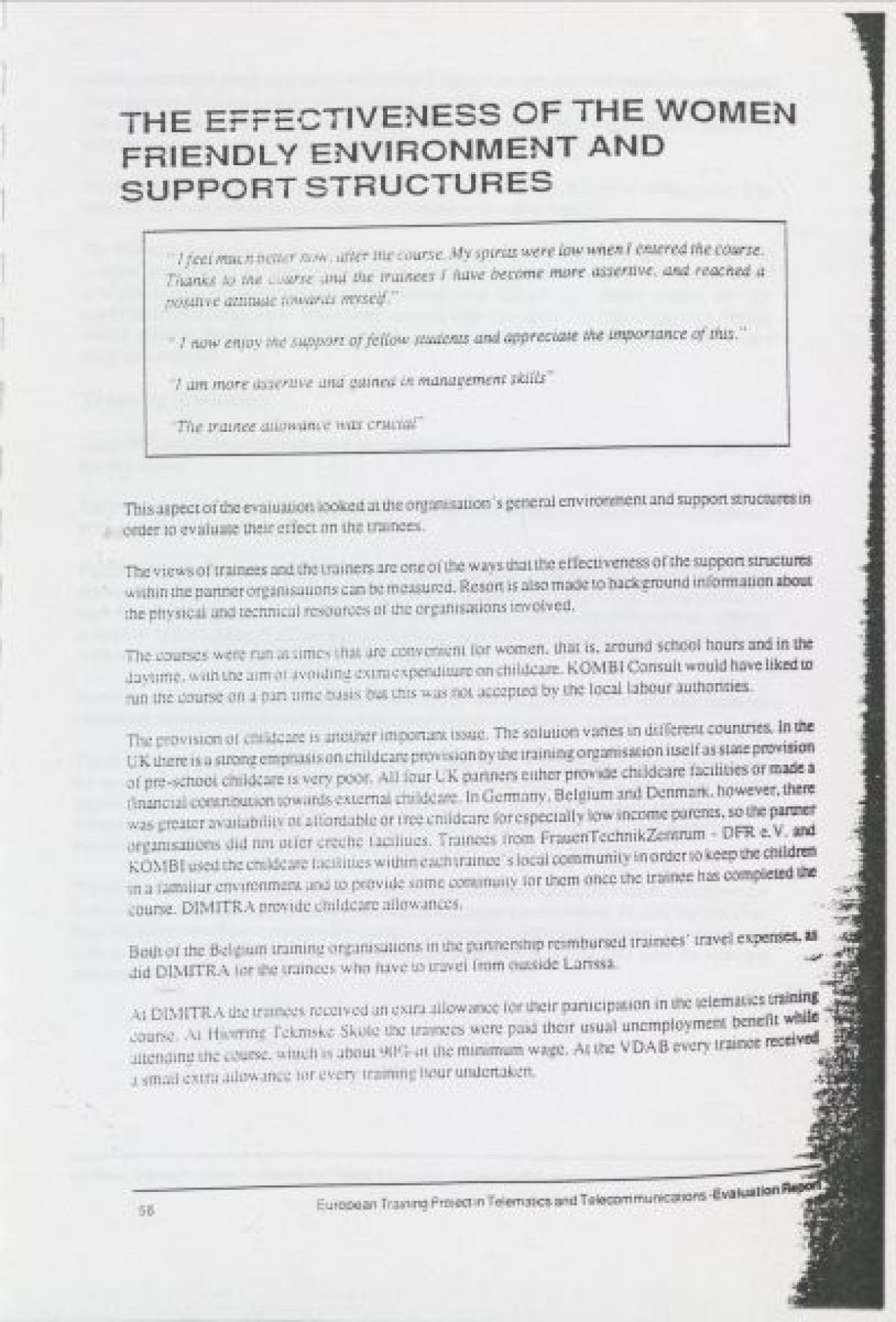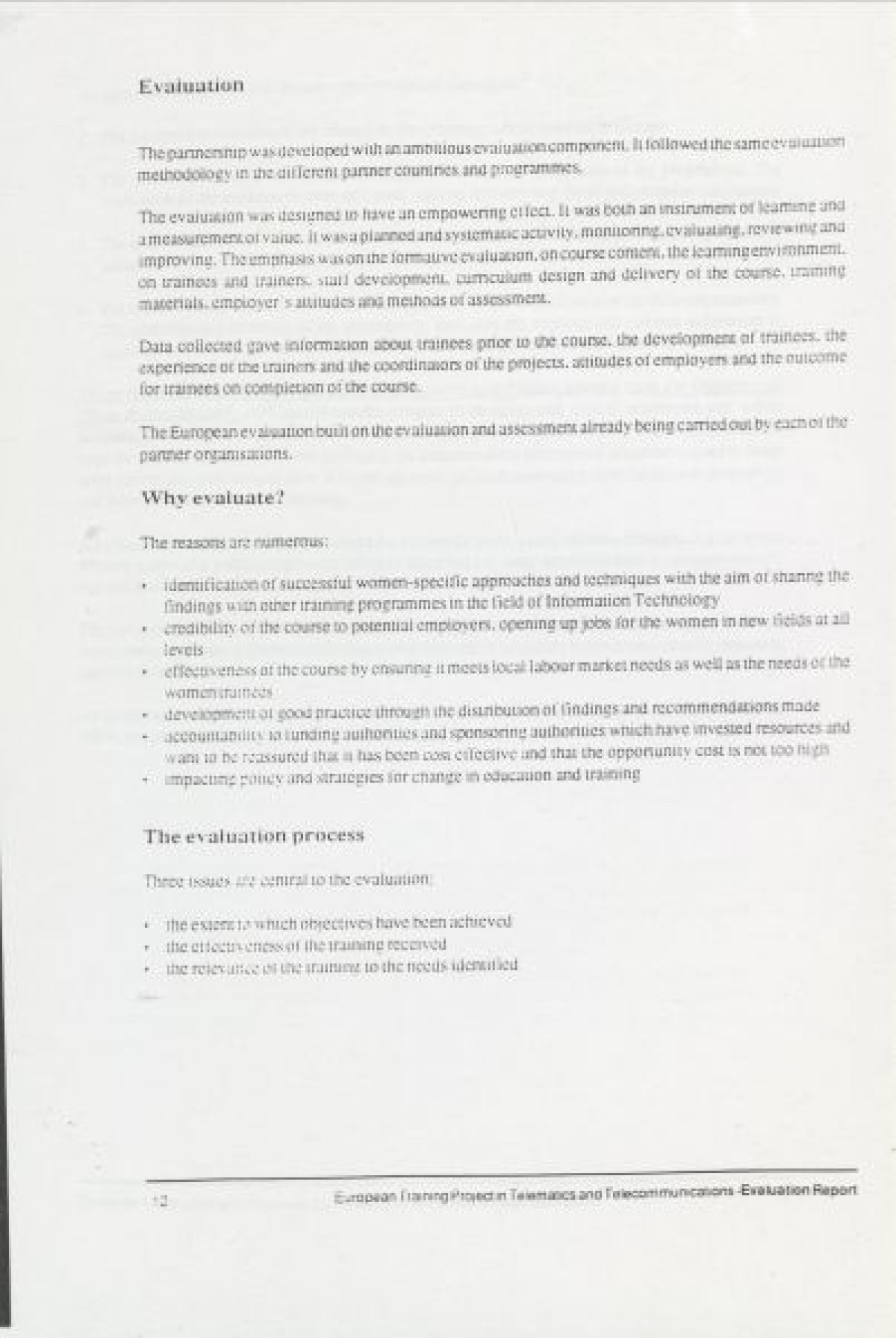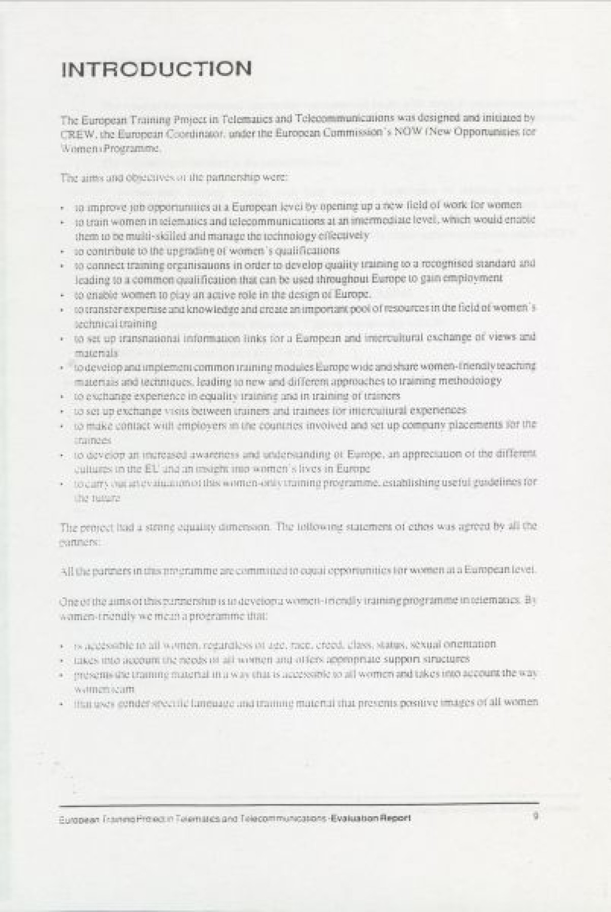 Pages from a report, containing an evaluation summary of a European project to train women in Telematics and Telecommunications. Includes an Executive Summary outlining a women's specific approach to training in technology; introduction and background to the project; reports from women trainees, graphs showing levels of previous employment; and a report on the effectiveness of the women friendly environment and support structures.