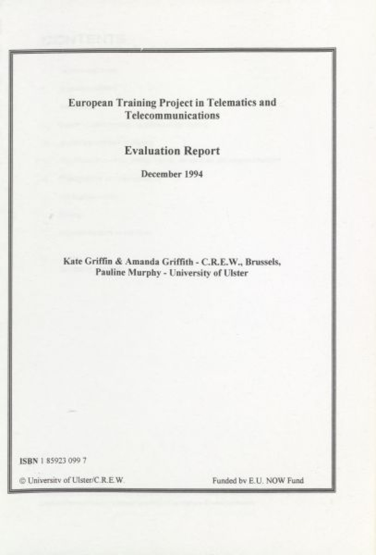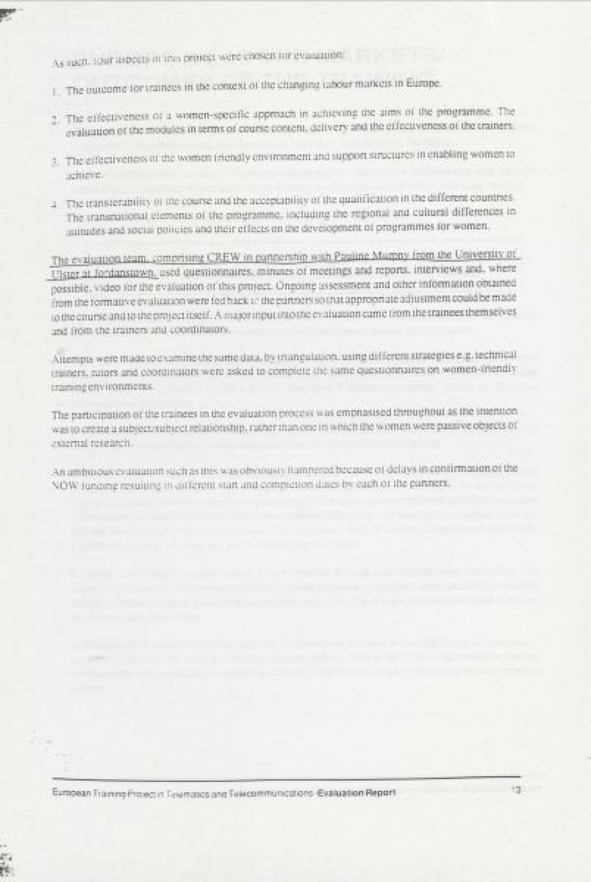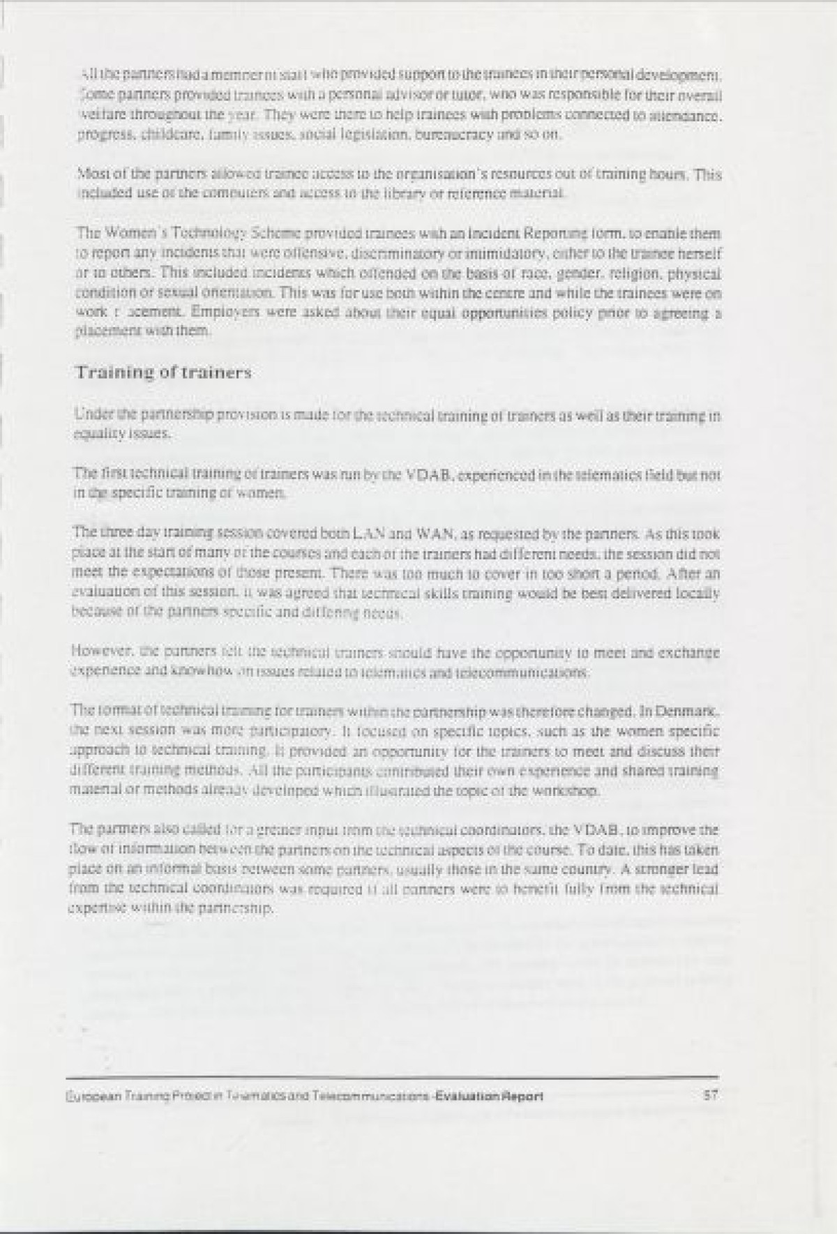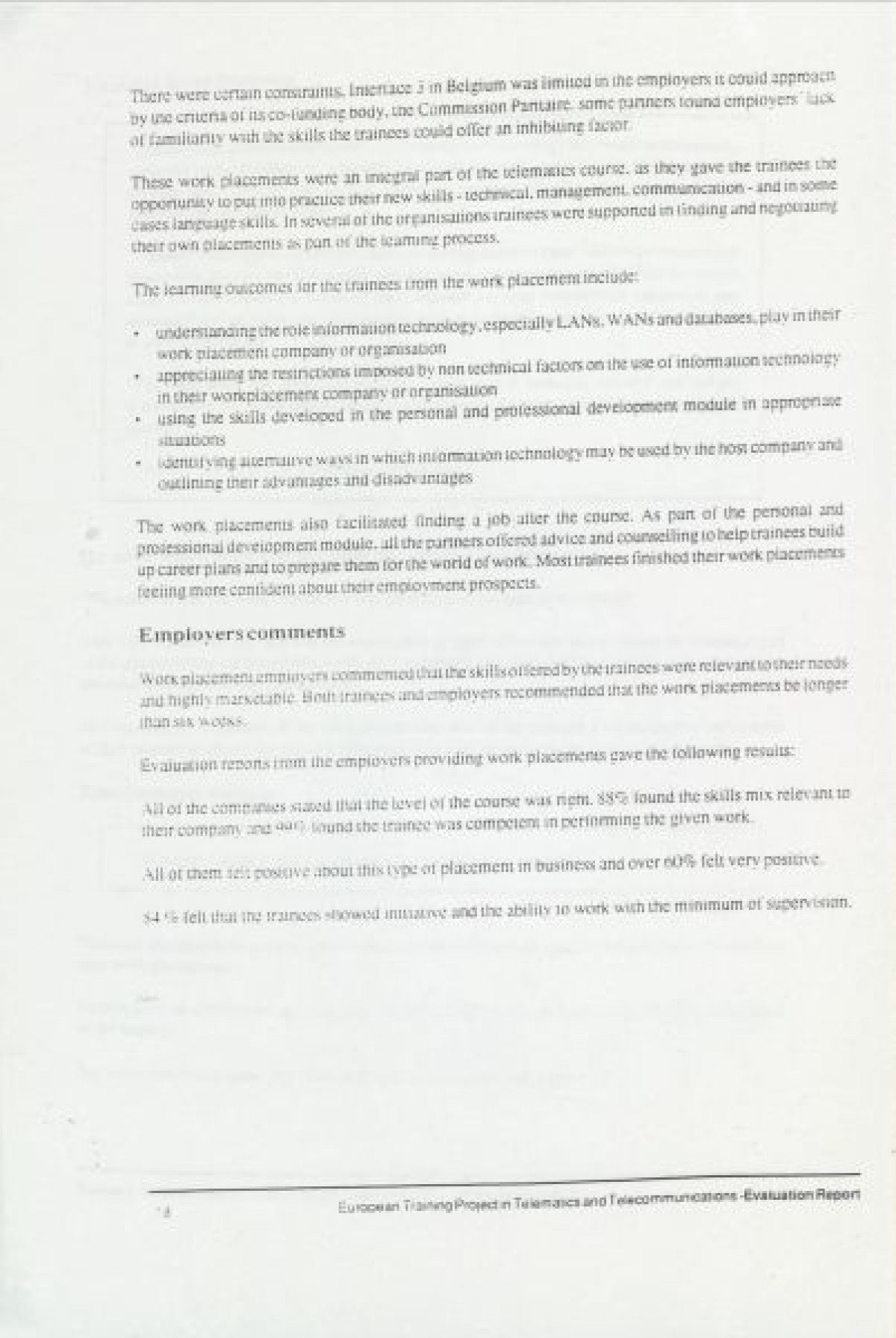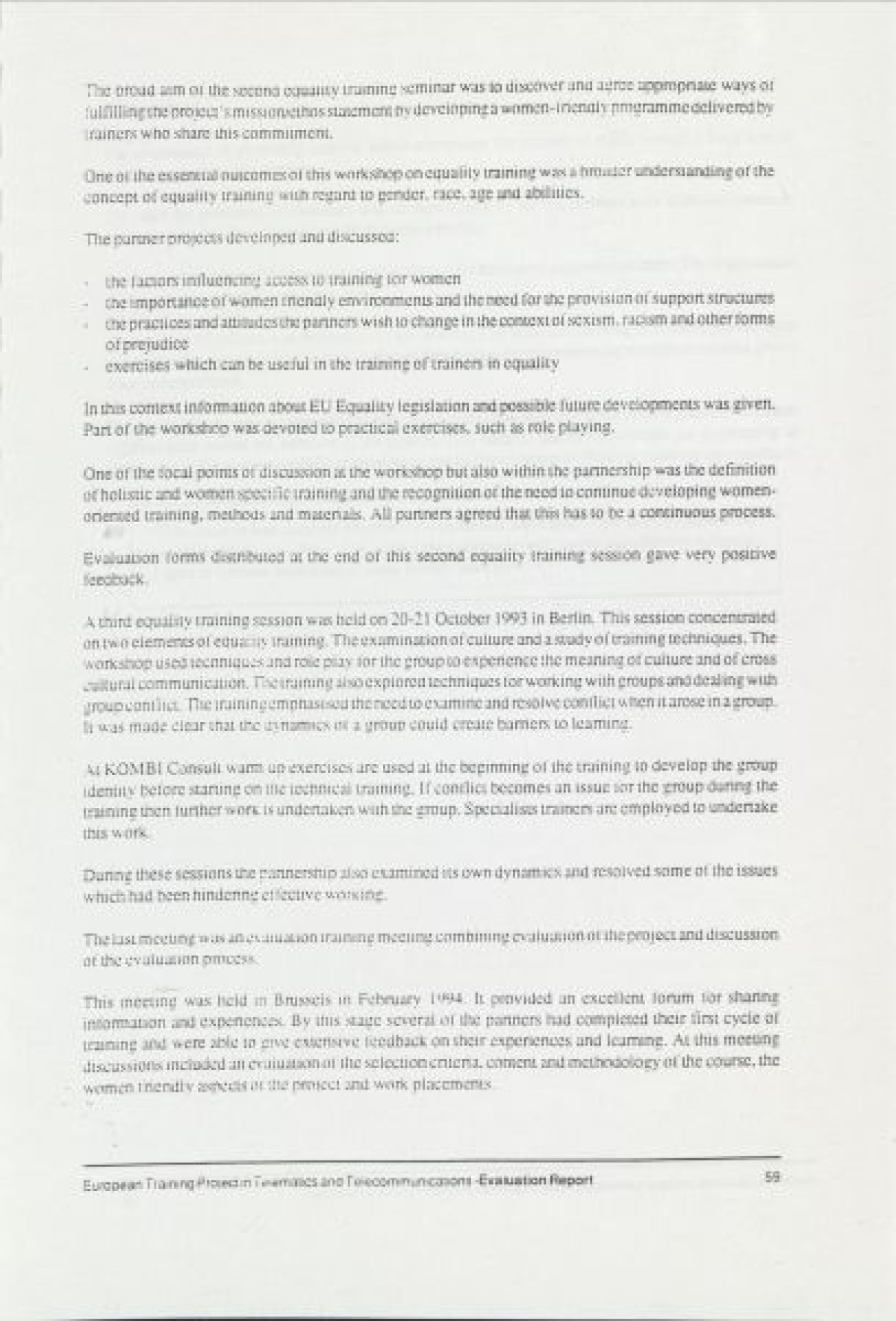 Pages from a report, containing an evaluation summary of a European project to train women in Telematics and Telecommunications. Includes an Executive Summary outlining a women's specific approach to training in technology; introduction and background to the project; reports from women trainees, graphs showing levels of previous employment; and a report on the effectiveness of the women friendly environment and support structures.