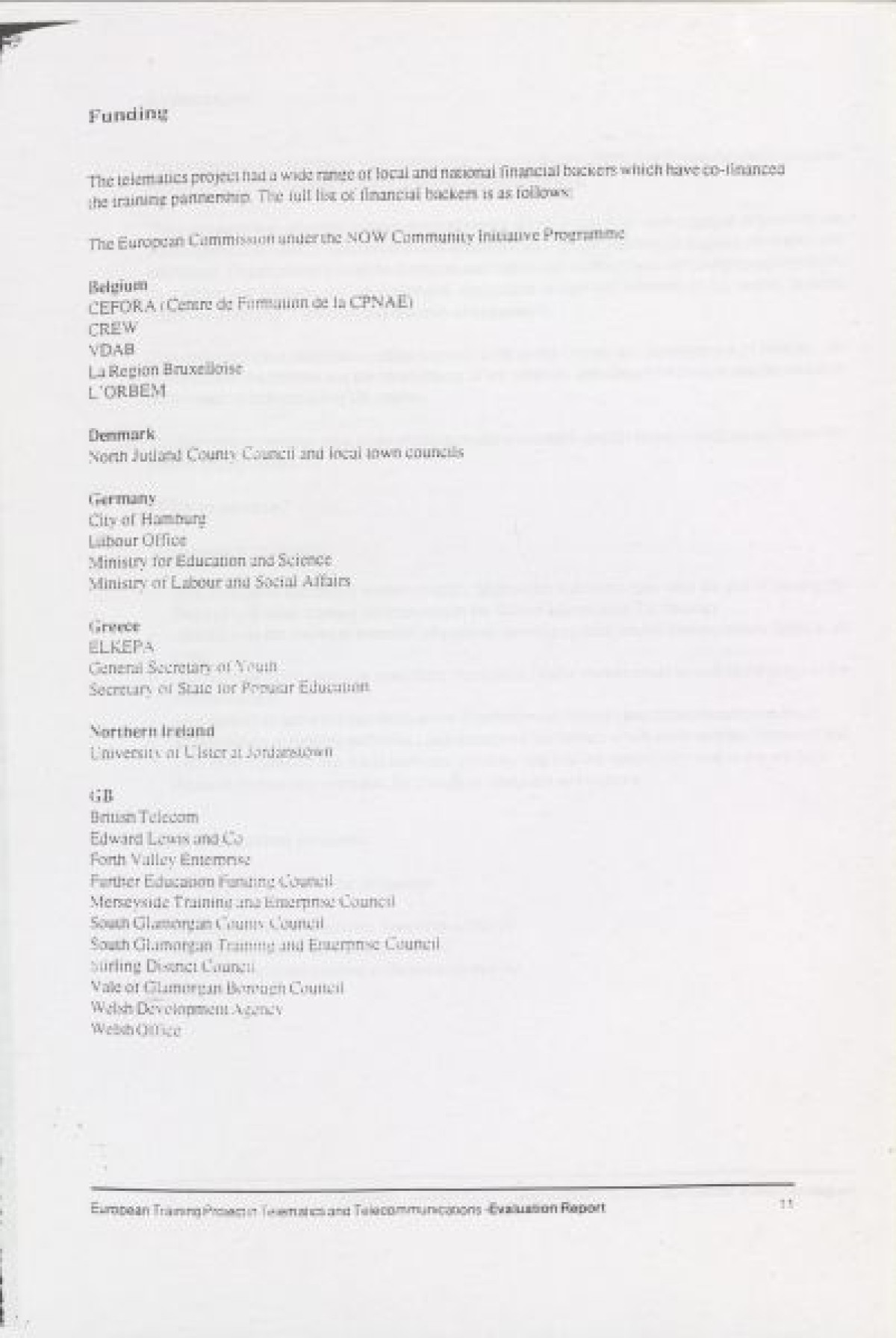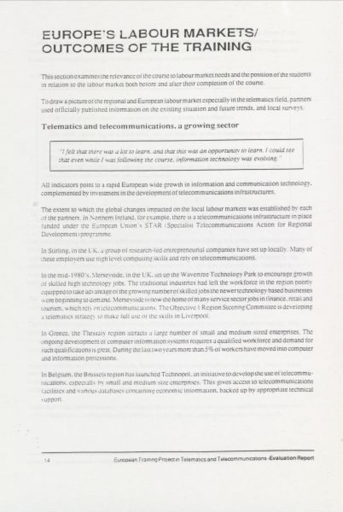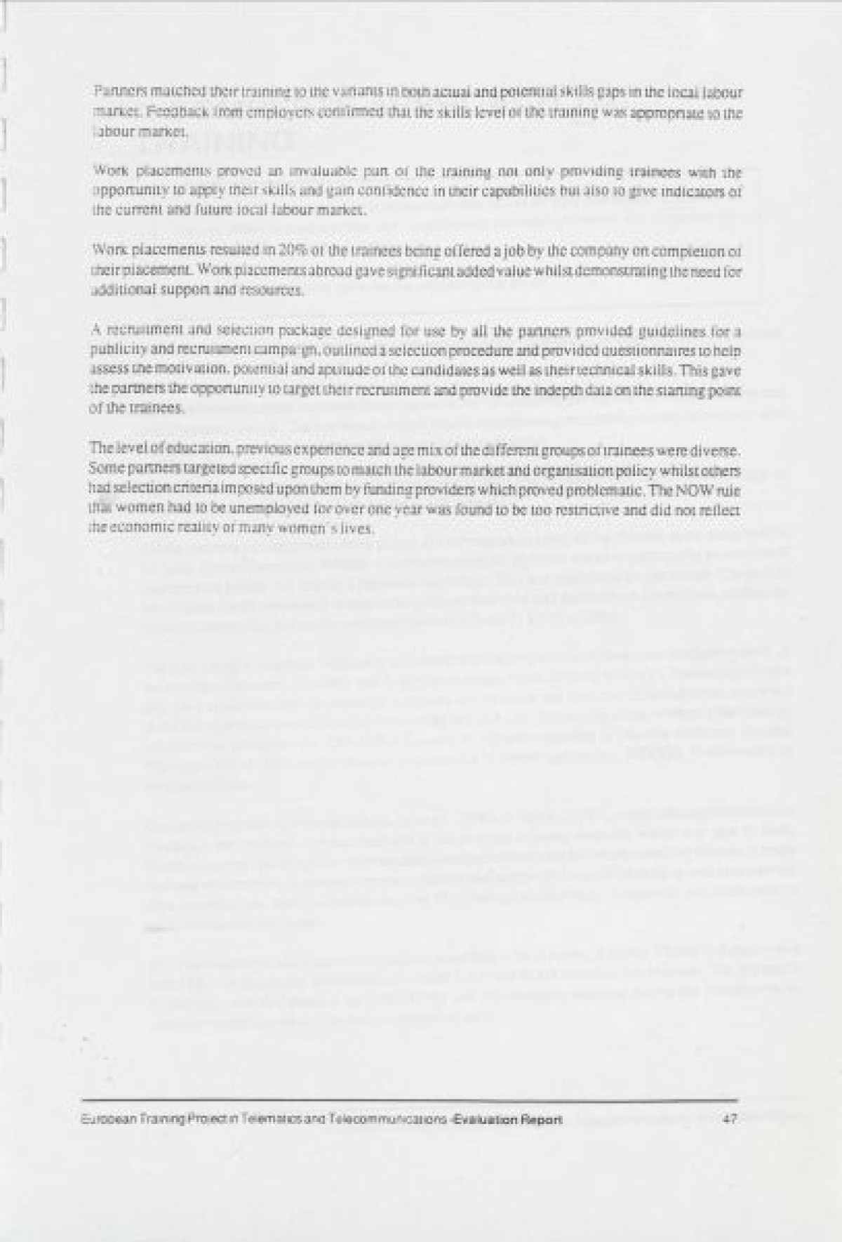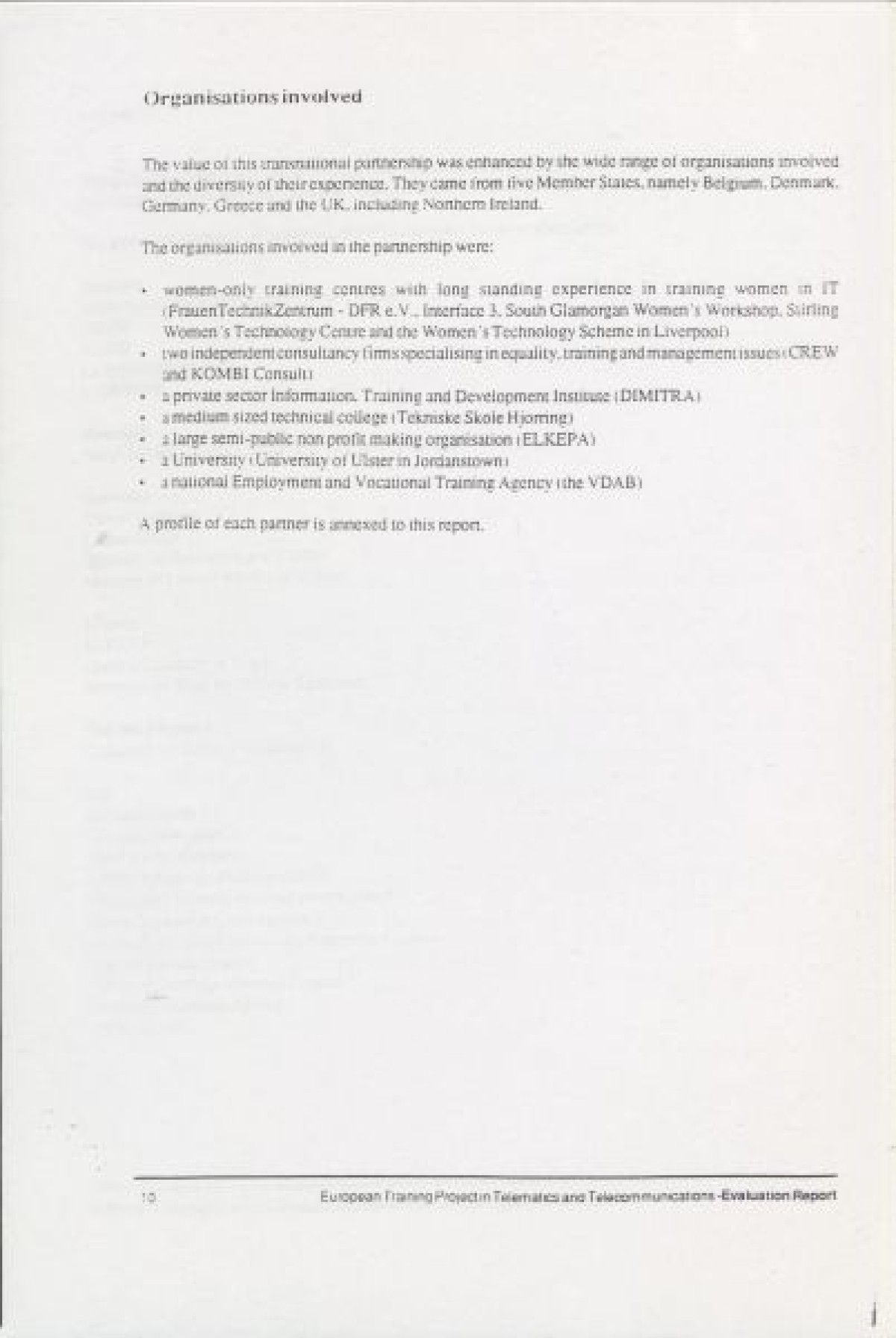 Pages from a report, containing an evaluation summary of a European project to train women in Telematics and Telecommunications. Includes an Executive Summary outlining a women's specific approach to training in technology; introduction and background to the project; reports from women trainees, graphs showing levels of previous employment; and a report on the effectiveness of the women friendly environment and support structures.