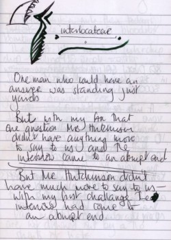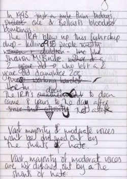 An extract from Andrea Catherwood's handwritten notes taking during her time reporting the Holy Cross Primary School protest in 2001 for the ITN Tonight Programme.