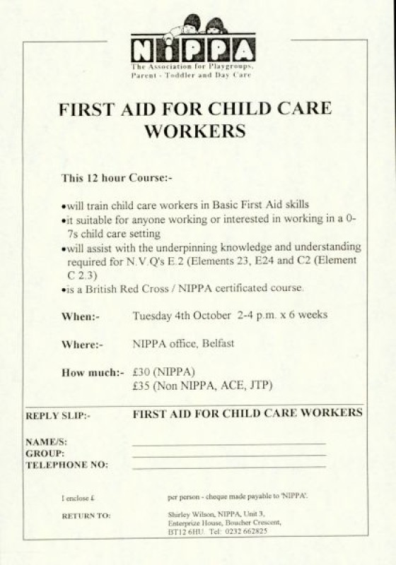 Leaflet for course 'First Aid for Child Care Workers', organised by the Northern Ireland Pre-School Playgroup. Printed on beige paper. Scheduled to begin on Tuesday 4th October 1994.