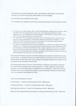 Proposal for a Major Individual Award with the Arts Council Northern Ireland, written by Rosemary Jenkinson, applying for 12-month funding support to write a short story collection. Contains evidence of artistic quality, measurements of success, and financial breakdown for the project.
