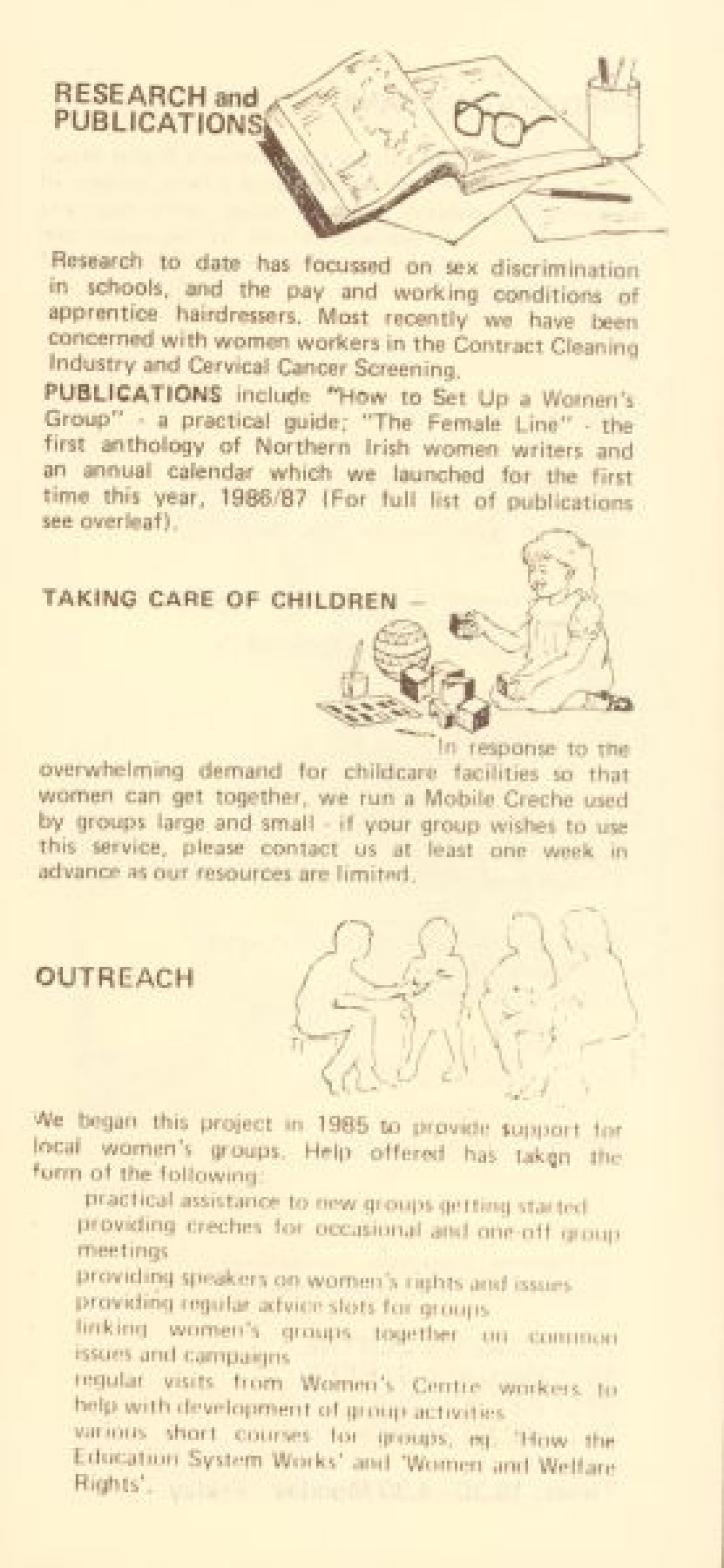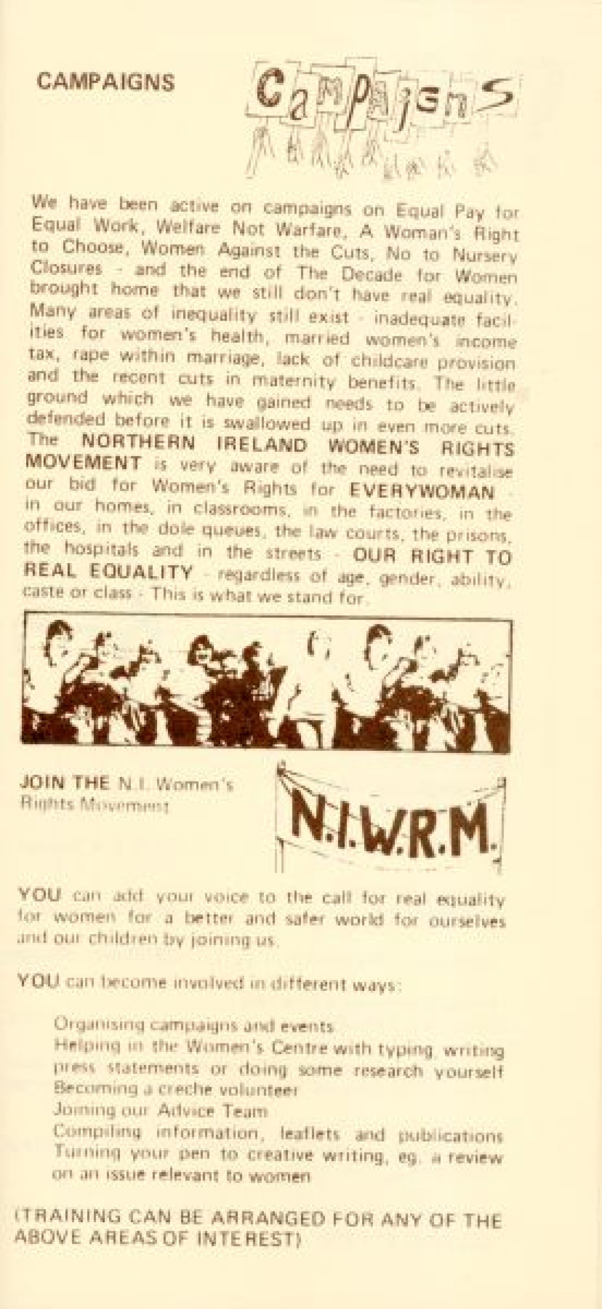 Northern Ireland Women's Rights Movement c1985-89. Provides background information on its outreach activities and campaigns, advice on how to get involved and contact details for other women's centres across Northern Ireland.