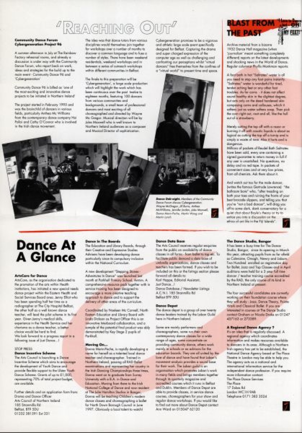 Community Dance Forum Cybergeneration Project 96 featuring collaborations between Jill Burns, Anthea McWilliams, Jennifer Jordan, Wayne McGregor, Jules Maxwell, Donna Marin-Pache, Martin Wong, and Martin Lynch.