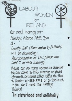Labour Women for Ireland activities, including International Women's Day delegation to Armagh, demonstration at Downing Street against strip-searching of women prisoners in Armagh, and a National Labour Women's Conference. Also includes a handwritten note about an upcoming meeting, organised by Di Parkin and Sarah Roelofs.