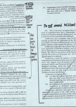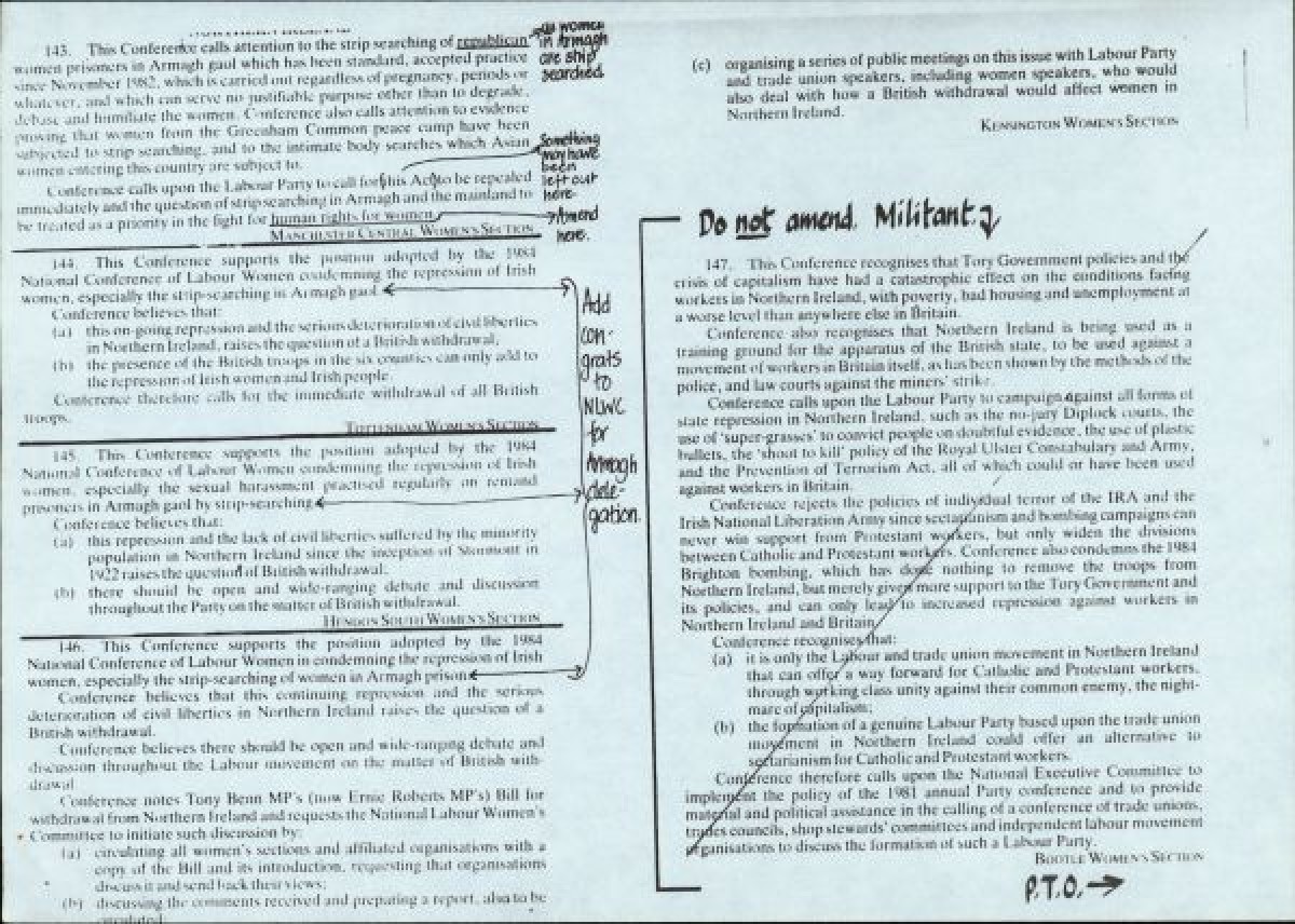 Labour Committee on Ireland, Women's Section. Contains a list of amendments for literature about an upcoming conference on the issue of Strip-Searches in Northern Ireland.