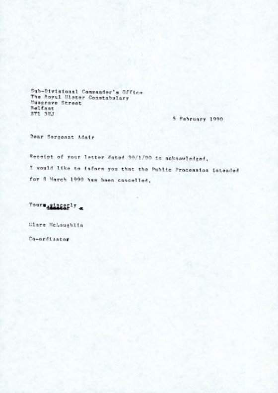 Letter from Clare McLoughlin of the Women's Centre to a Royal Ulster Constabulary Sergeant regarding the cancellation of a Public Procession on 8th March, 1990.