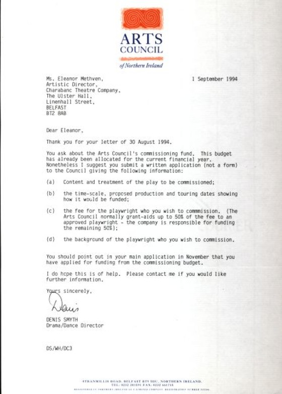 Arts Council of Northern Ireland funding to commission a play at Charabanc Theatre Company.