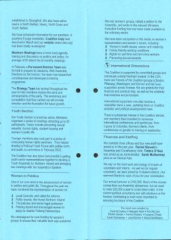 Northern Ireland Women's Coalition Annual Report compiled by Chris McCartney, Margaret Ward, Ann McCann, Rachel Stewart, Patricia Wallace, Fearghal O'Reilly, Sarah McAtamney, Jane Morrice, Monica McWilliams. Contains summary of Assembly activities, policy development, activities in constituencies and local council, hosting schools, churches, community groups, women's groups and international groups at Stormont, and re-designation to ensure political stability and save the peace agreement.