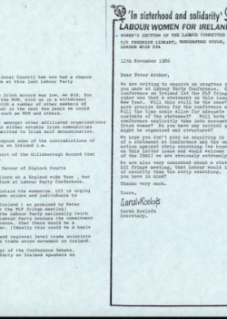Labour Women for Ireland (LWI). Discusses model resolutions from the National Labour Women's Conference, held in Blackpool 1987. Includes reproductions of letters concerning strip-searching and Anglo-Irish Accord, Minutes from a LWI meeting in Manchester, and notes on a