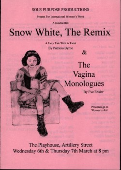 Leaflet for 'Snow White, The Remix' by Patricia Byrne, and 'The Vagina Monologues' by Eve Ensler, a double bill for