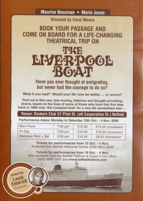 Poster publicising the performance of the 2006 play 'The Liverpool Boat' at the Dockers Club, Belfast. Play by Maurice Bessman and Marie Jones and directed by Carol Moore.