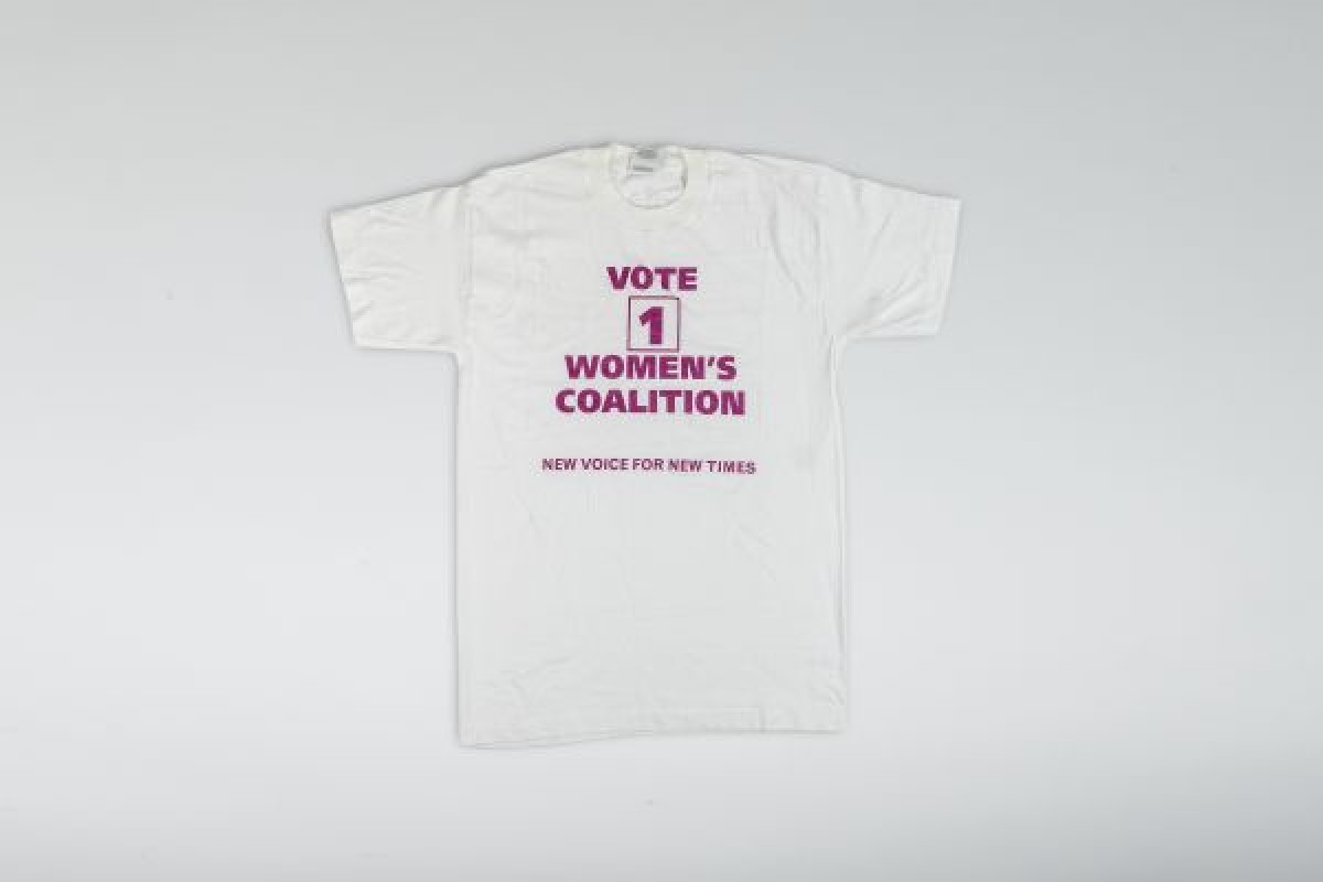White t-shirt, 'Vote Women's Coalition, New voice for new times'