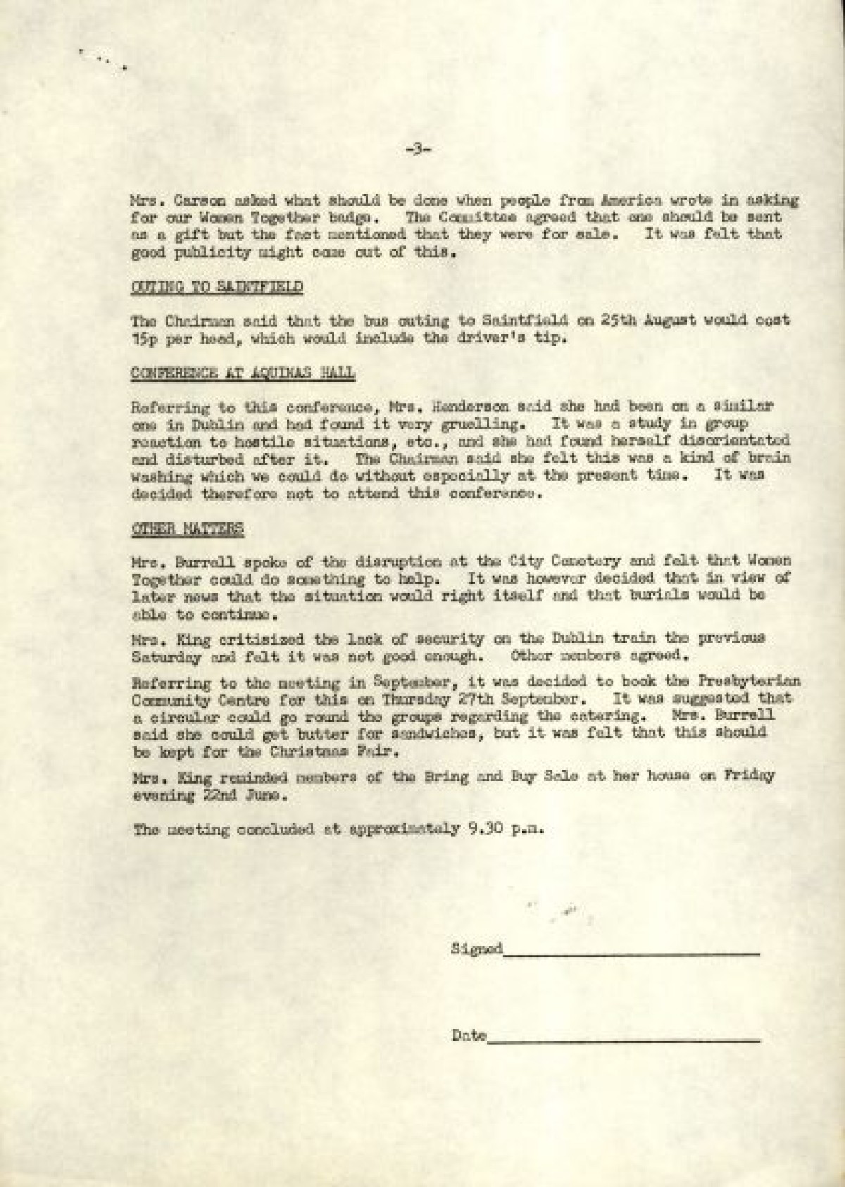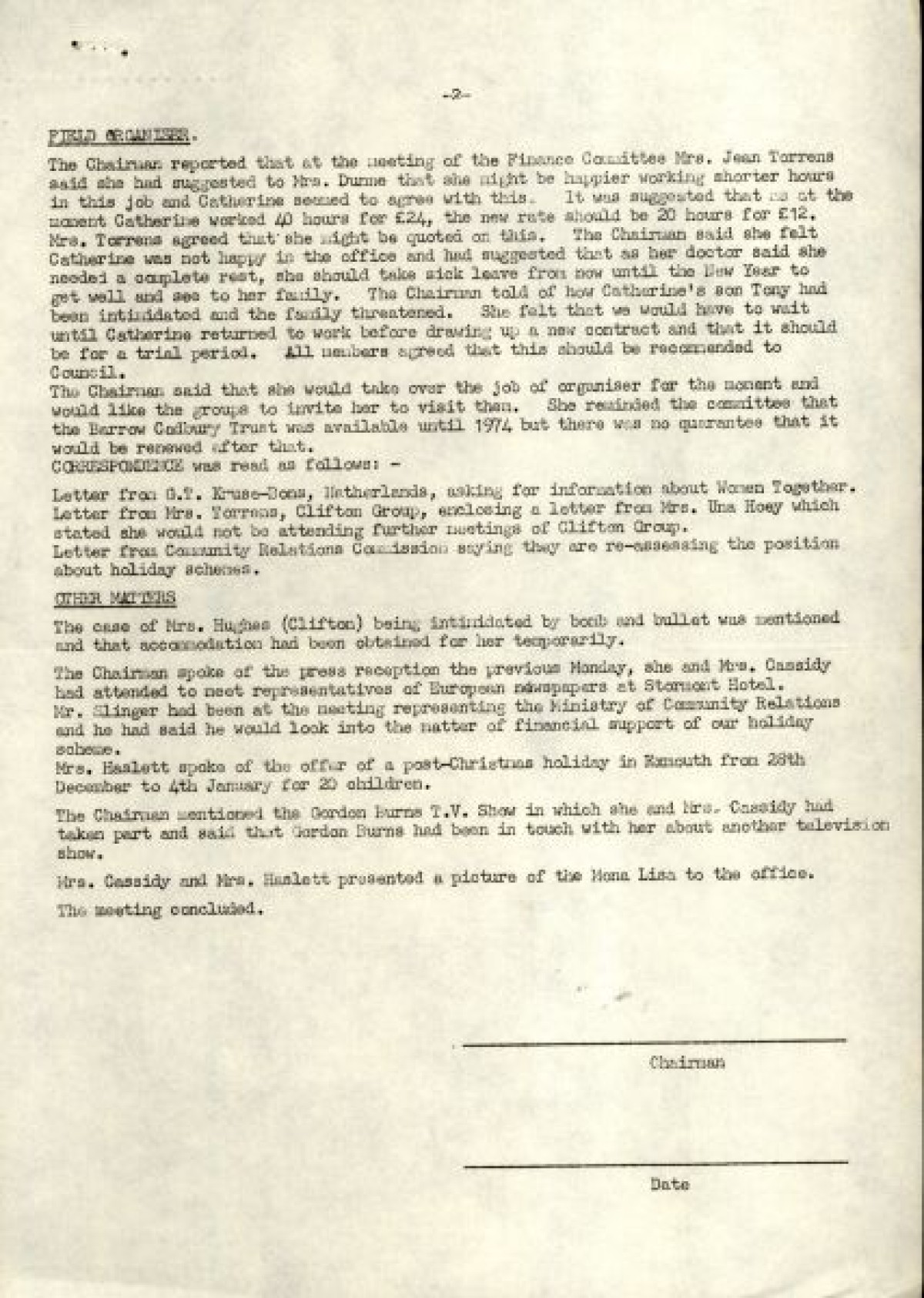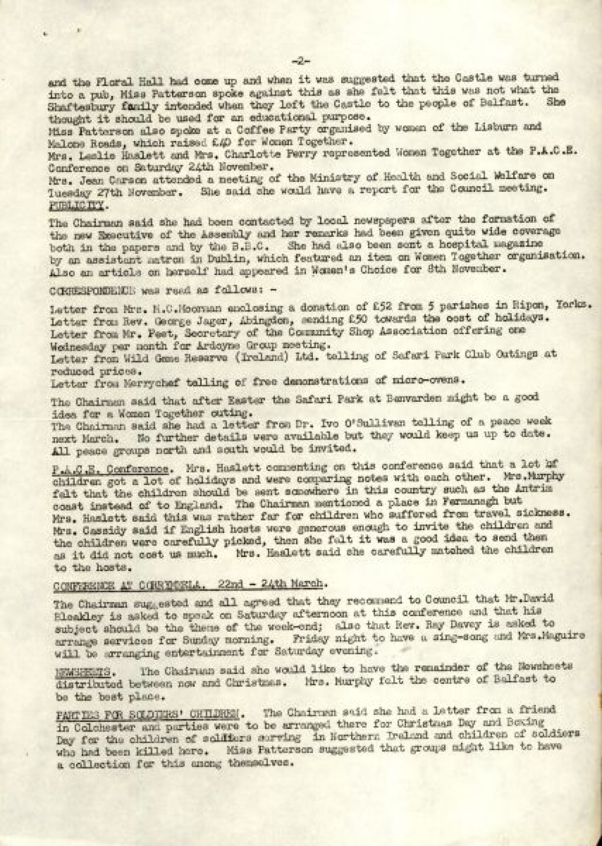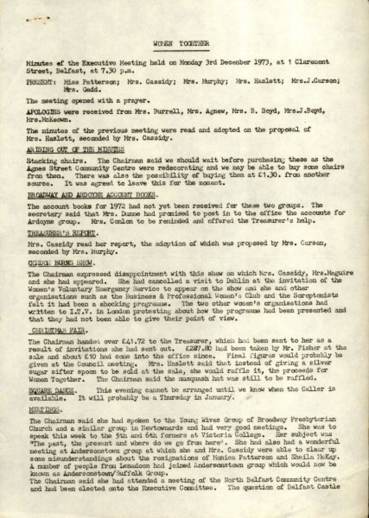 Bundle of typewritten minutes from Women Together meetings, during the year 1973. Includes a Report from Chairman Saidie Patterson, identifying highlights from the year's work, decline in membership, moral support, publicity, a reading group and expressions of gratitude to Betty Gadd, Jean Carson, Nancy Cassidy, and Ruth Agnew. Minutes from meetings include lists of members, activities and progress of Women Together, correspondences, events and visits, and updates on a newsheet, produced by Joy Henderson.