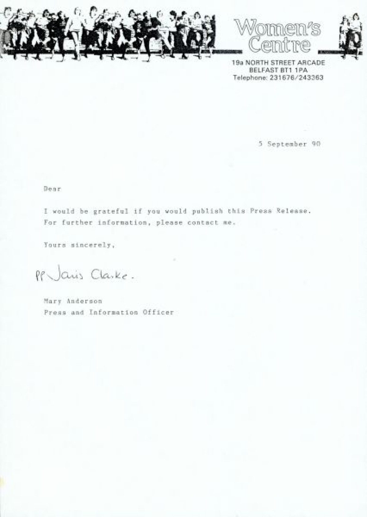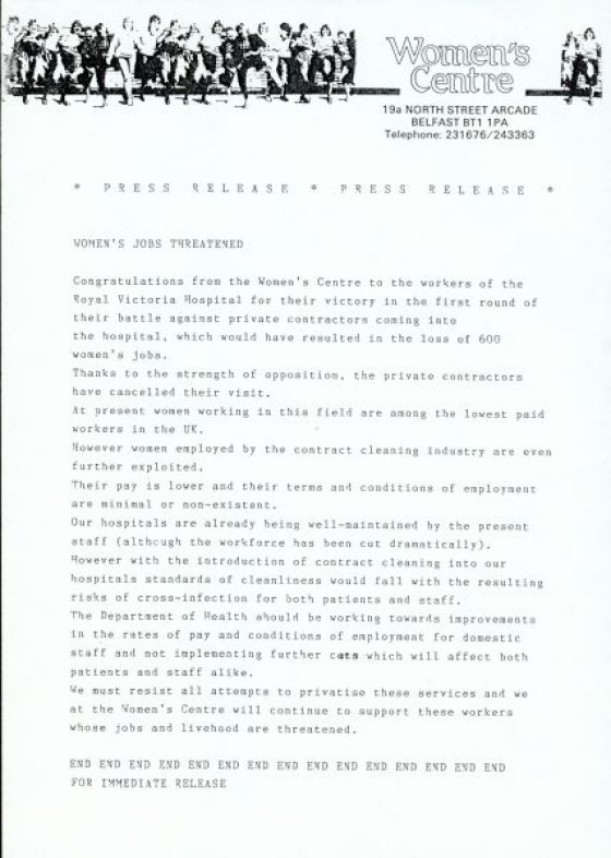 Northern Ireland Women's Rights Movement titled 'Women's Job Threatened', regarding the campaign against the privatisation of the Royal Victoria Hospital and subsequent potential loss of 600 women's jobs.