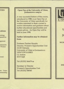 Promotional pamphlet for a women's education course, titled "Time for Me," organised by Pauline Murphy at the University of Ulster, Jordanstown. Contains a descriptive outline of morning and afternoon sessions, with details of courses, venues and dates. Includes an application form and information about expanded course choices, including an Introduction to Computing, Political Issues, Child Development, Basic French, Creative Writing, Women's Studies, Modern Irish, English, History, Sociology, and Assertiveness.